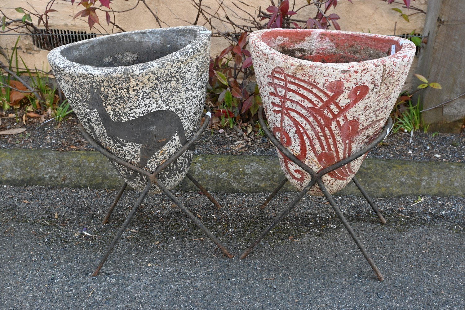 A PAIR OF AUSTRALIAN HAND PAINTED PLANTERS ON WROUGHT IRON BASES (A/F) (47H X 31W X 26D CM) (LEONARD JOEL DELIVERY SIZE: LARGE)