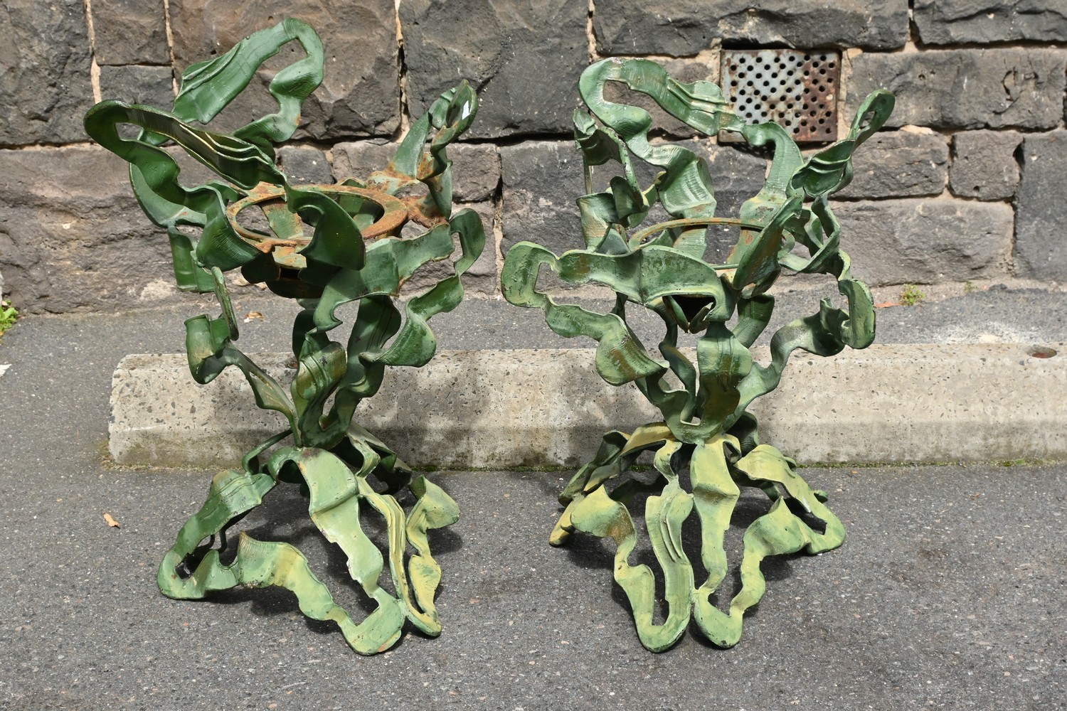 A PAIR OF VINTAGE WROUGHT IRON GREEN BRUTALIST FORM PLANT STANDS (A/F) (75H X 51D CM) (LEONARD JOEL DELIVERY SIZE: LARGE)