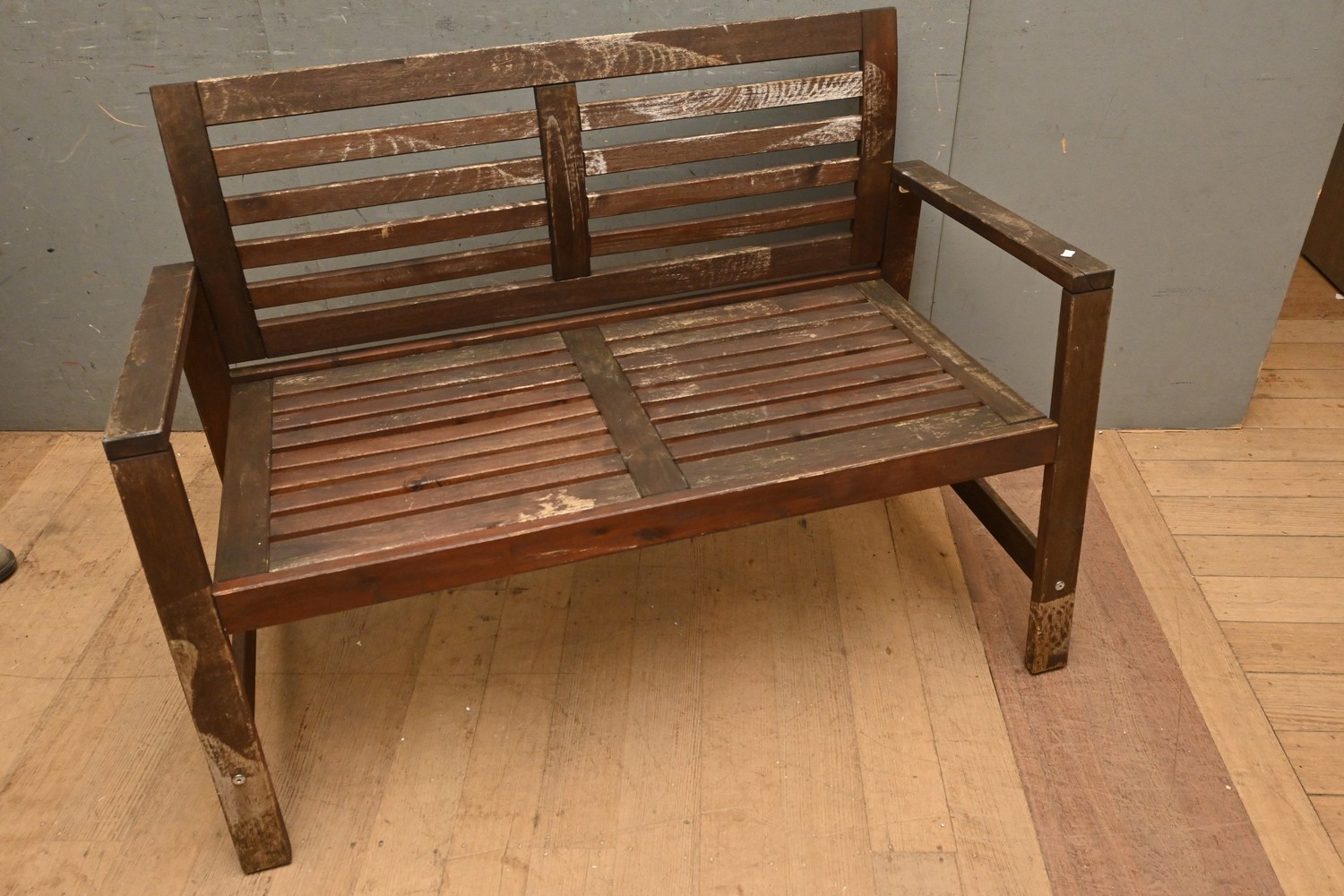A TEAK SLATTED GARDEN BENCH (A/F) (81H X 117W X 56D CM) (LEONARD JOEL DELIVERY SIZE: LARGE)