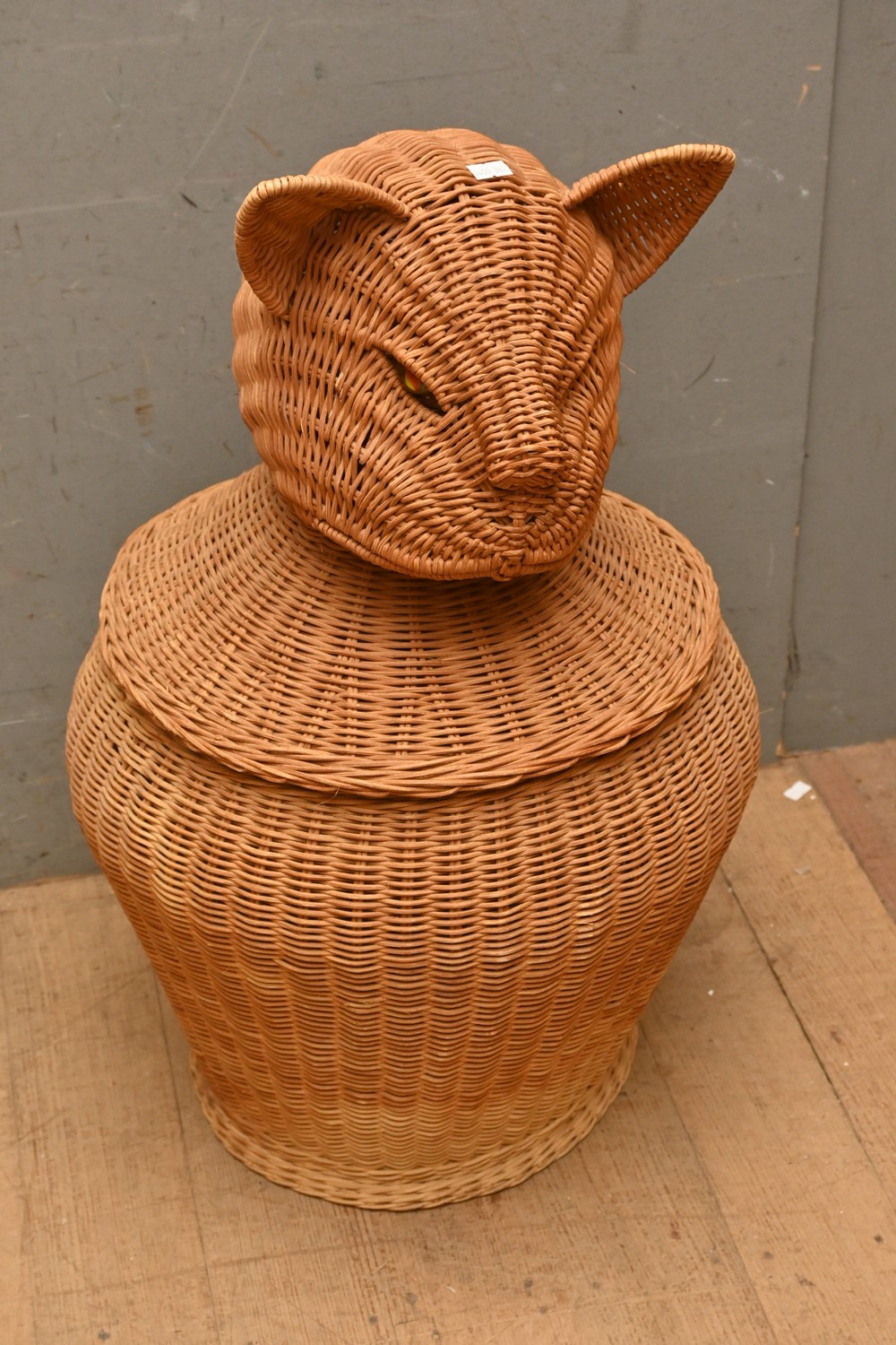 A WOVEN CANE CAT FORM BASKET WITH ORIGINAL MARBLE GLASS EYES (68H X 46D CM) (LEONARD JOEL DELIVERY SIZE: MEDIUM)