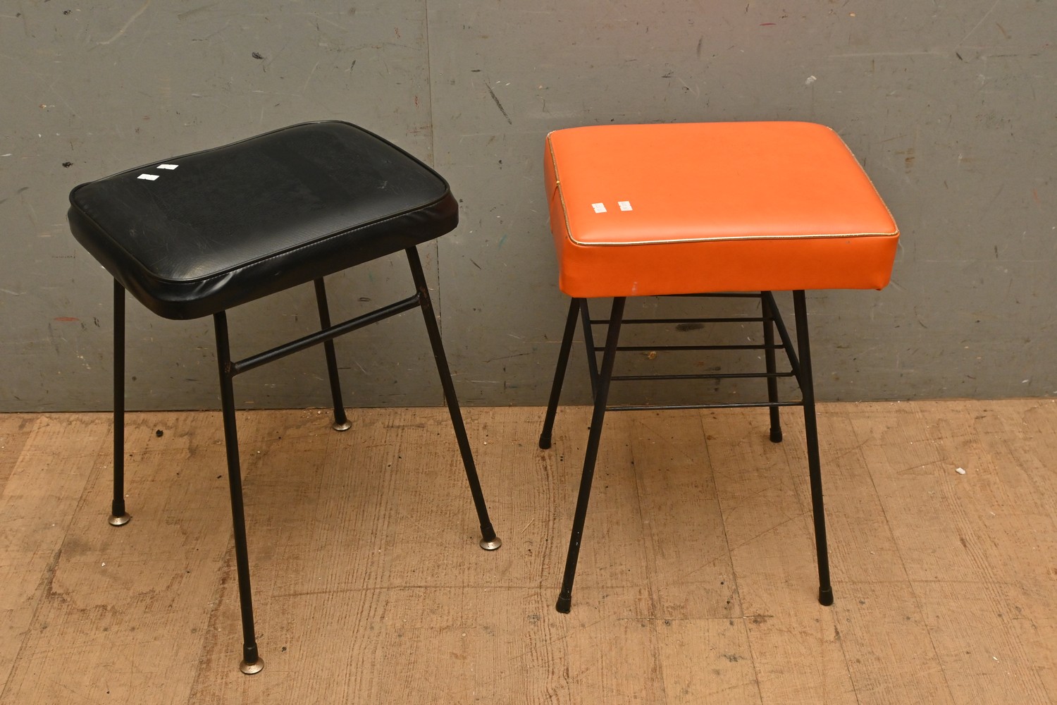 TWO VINTAGE BLACK METAL BASED VINYL STOOLS (52H X 37W X 30D CM) (LEONARD JOEL DELIVERY SIZE: MEDIUM)
