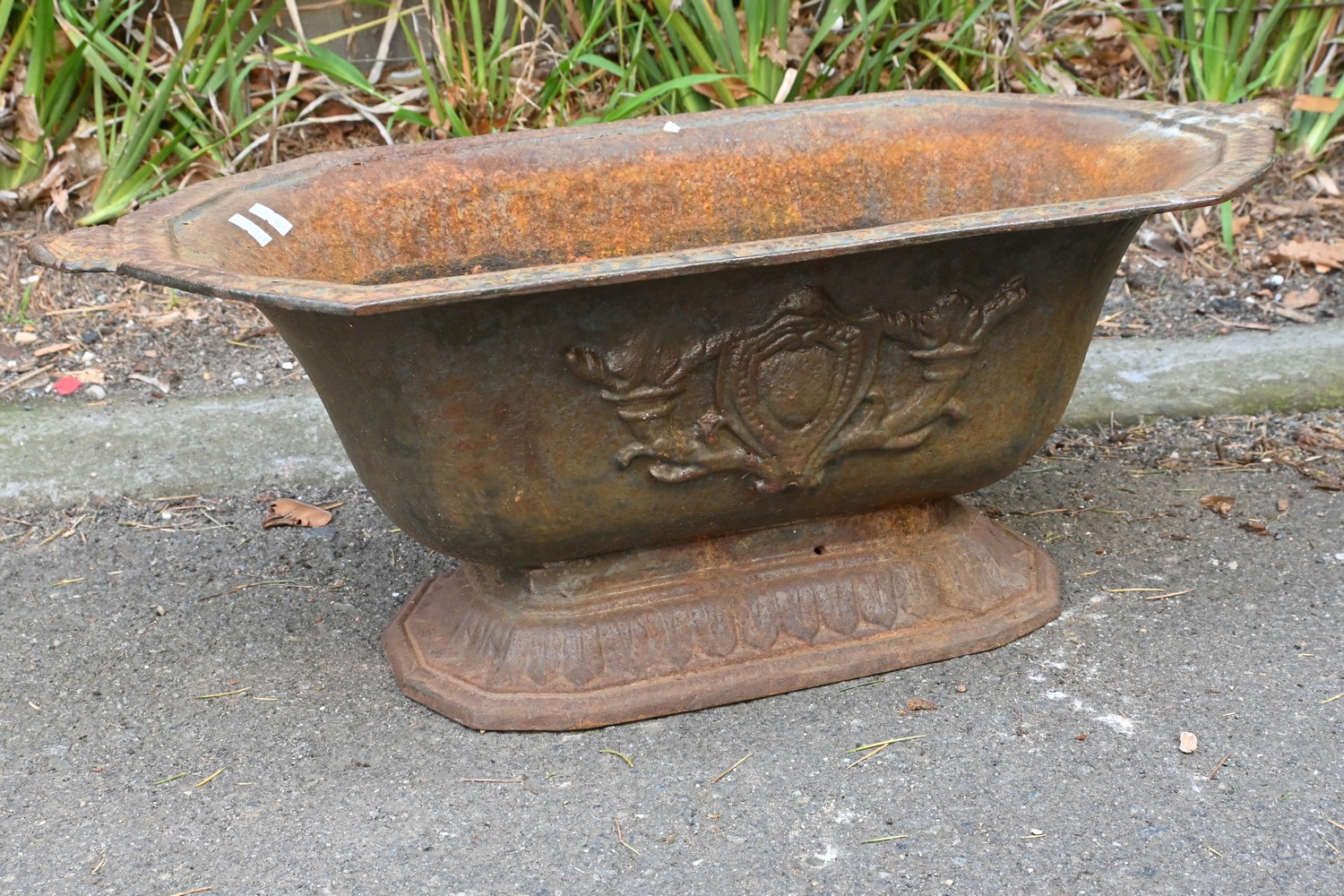 A 19TH CENTURY FRENCH CAST-IRON TWO-HANDED PLANTER WITH FLORAL RAISED DECORATION TO SIDE (24H X 64W X 35D CM) (LEONARD JOEL DELIVERY SIZE: LARGE)