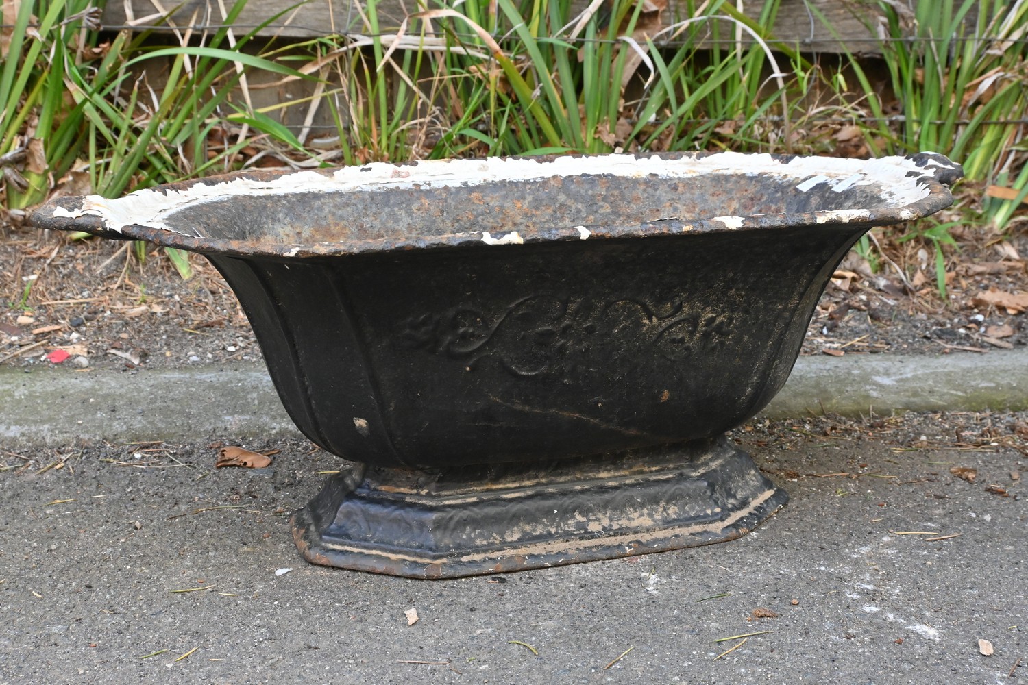 A 19TH CENTURY FRENCH CAST-IRON TWO-HANDED PLANTER WITH FLORAL RAISED DECORATION TO SIDE (24H X 64W X 33D CM) (LEONARD JOEL DELIVERY SIZE: LARGE)