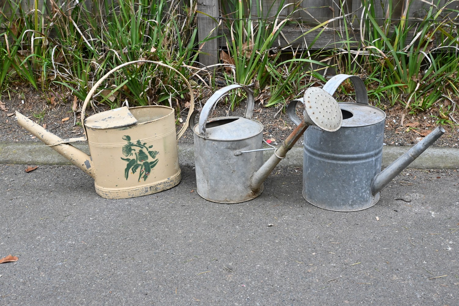 THREE VINTAGE GALVANISED METAL WATERING CANS (41H X 52W CM) (LEONARD JOEL DELIVERY SIZE: LARGE)