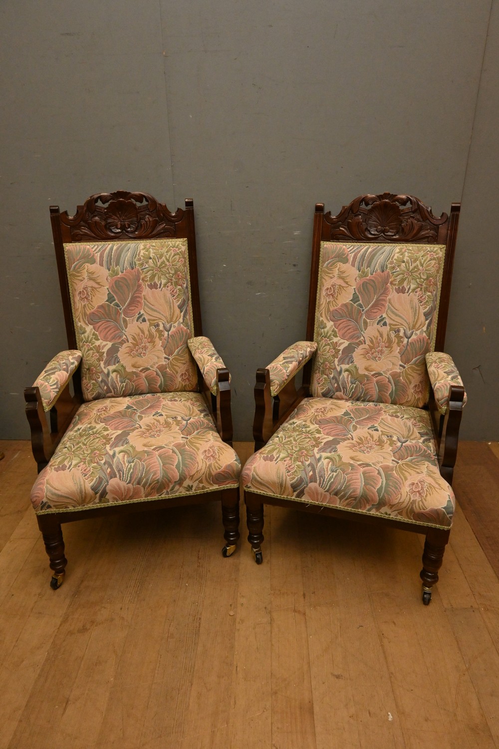 A PAIR OF LATE VICTORIAN WALNUT AND UPHOLSTERED ARMCHAIRS (A/F) (113H X 63W X 79D CM) (LEONARD JOEL DELIVERY SIZE: X-LARGE)