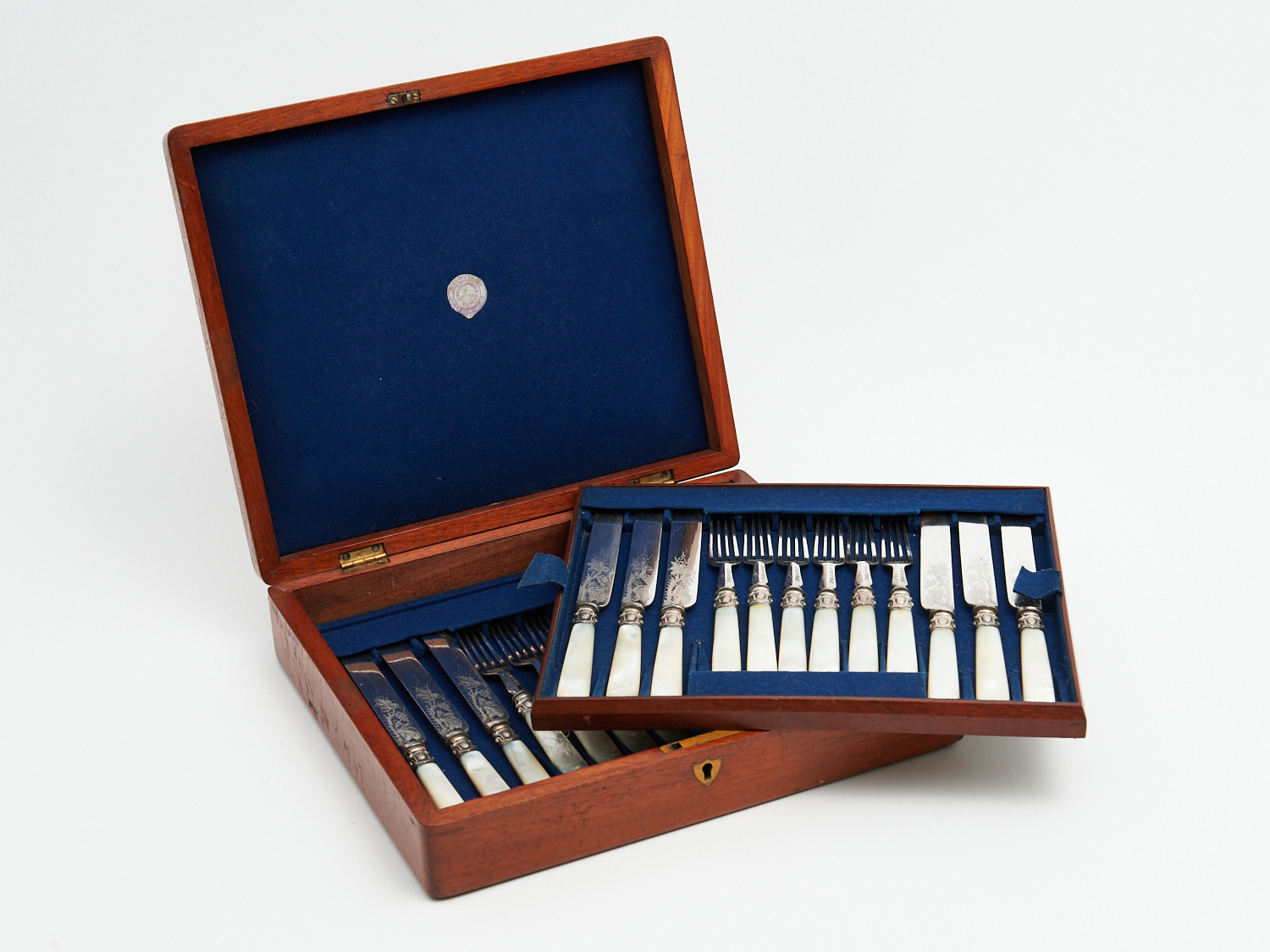 A MAHOGANY CASED MOTHER OF PEARL HANDLED FRUIT SET W.28CM, LEONARD JOEL LOCAL DELIVERY: SMALL