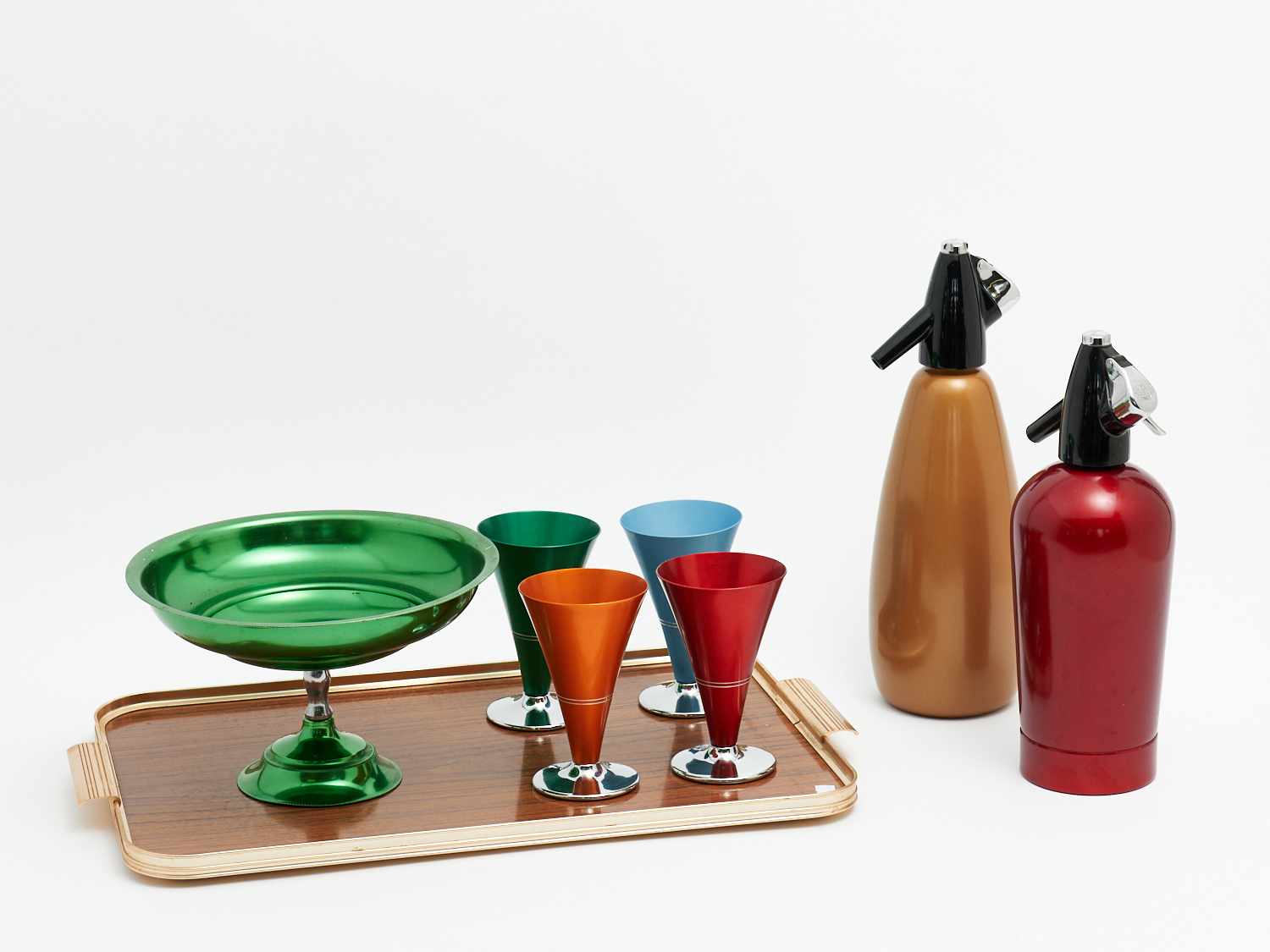 A GROUP OF VINTAGE METAL WARE ON CHROME TRAY, LEONARD JOEL LOCAL DELIVERY: MEDIUM