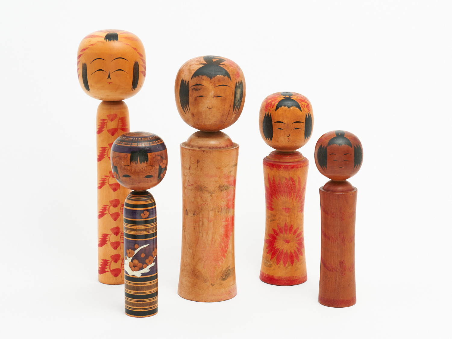 FIVE VINTAGE HAND PAINTED WOODEN JAPANESE KOKESHI DOLLS H.37CM (TALLEST), LEONARD JOEL LOCAL DELIVERY: SMALL