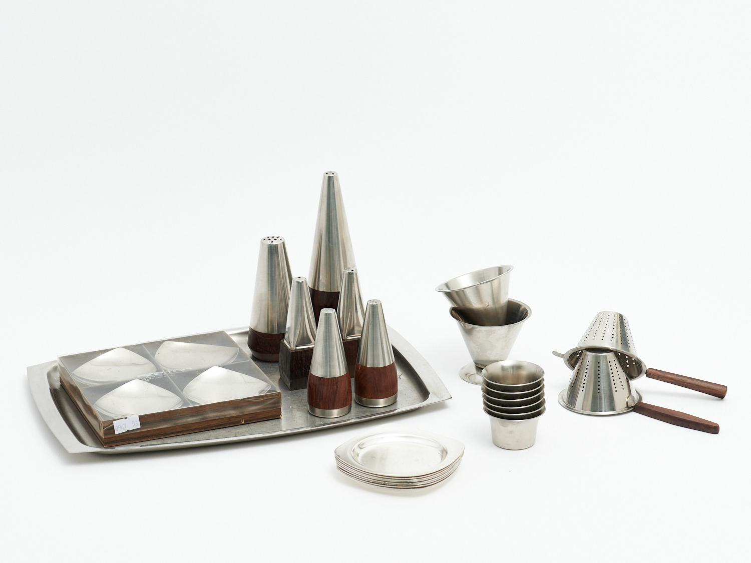 A GROUP OF DANISH STELTON, GERMAN WMF AND AMERICAN STAINLESS STEEL SERVING ITEMS L.34CM (LARGEST), LEONARD JOEL LOCAL DELIVERY: SMALL