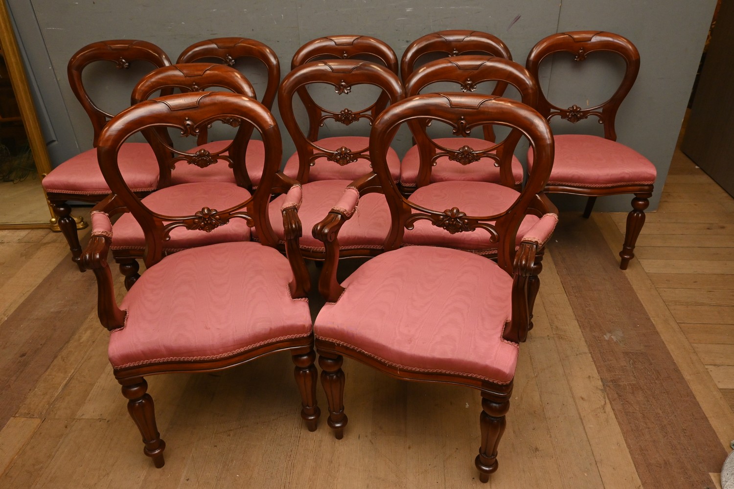 A SET OF TEN VICTORIAN-STYLE MAHOGANY DINING CHAIRS, COMPRISING TWO ELBOW CHAIRS AND EIGHT SIDE CHAIRS (91H X 58W X 50D CM) (LEONARD JOEL DELIVERY SIZE: X-LARGE)