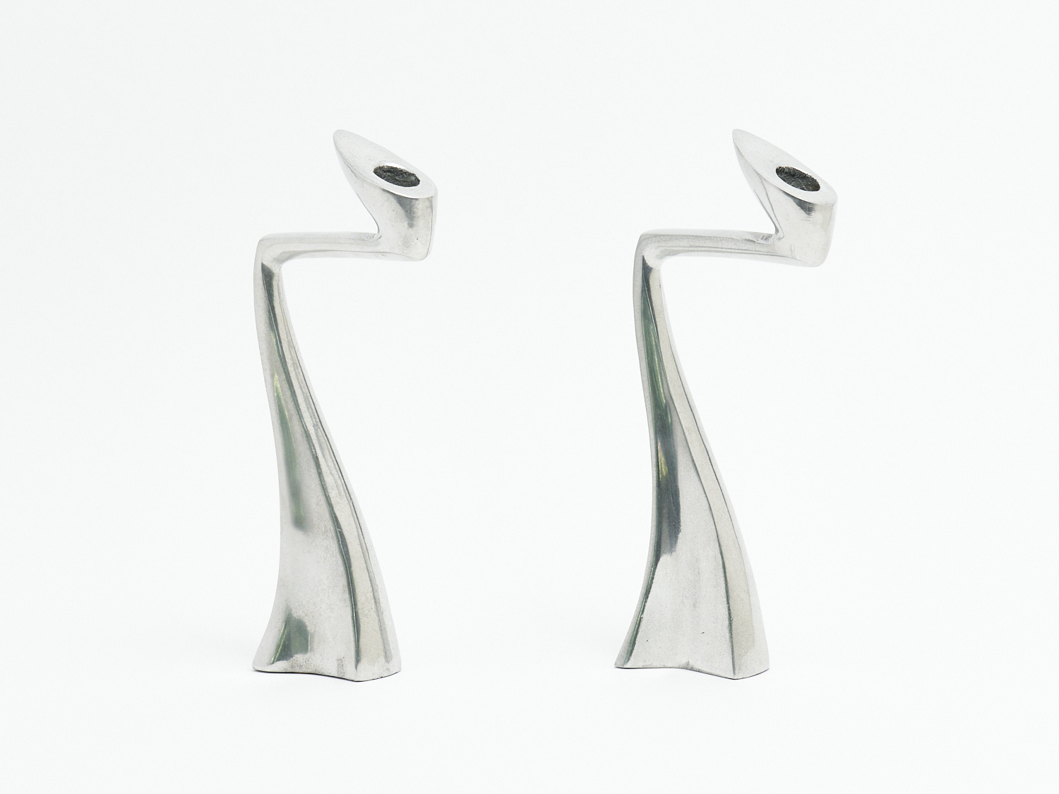 A PAIR OF VINTAGE MATTHEW HILTON Z SHAPE POLISHED ALUMINIUM SWAN CANDLESTICKS, H.24.5CM, LEONARD JOEL LOCAL DELIVERY: SMALL