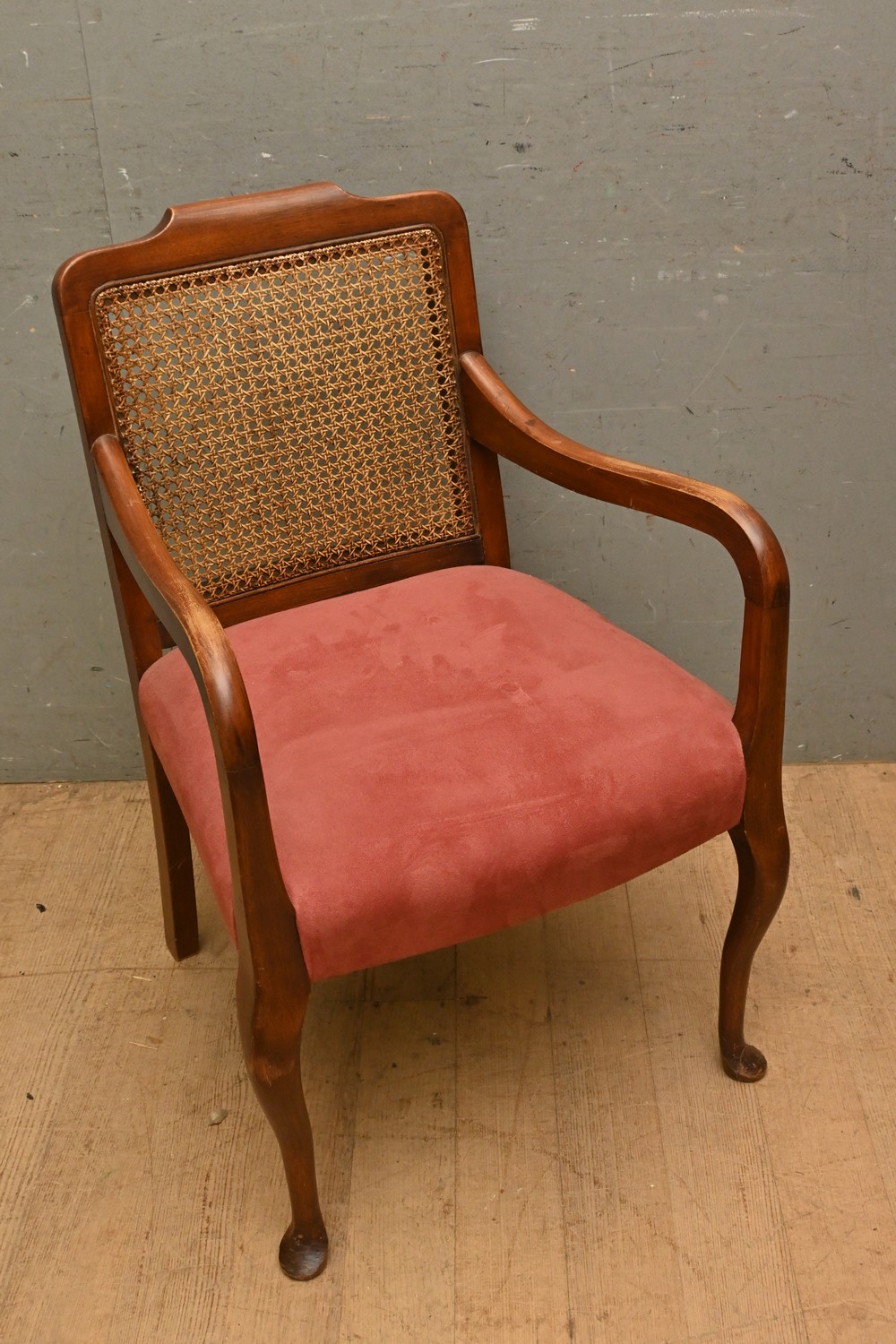 A HARDWOOD ELBOW CHAIR, WITH A CANED BACK ( 86H X 55W X 63D CM) (LEONARD JOEL DELIVERY SIZE: LARGE)