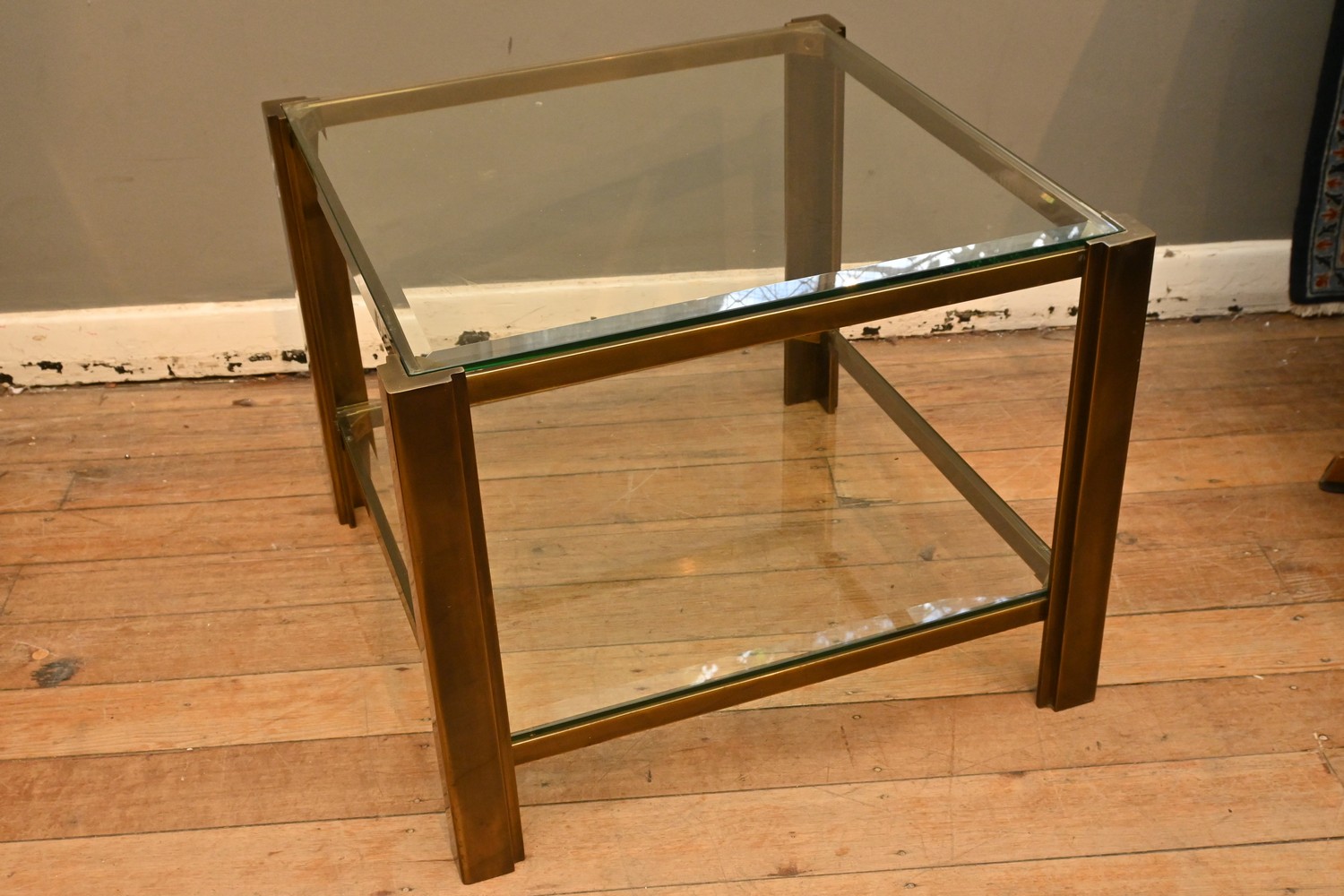 A HOLLYWOOD REGENCY STYLE TWO TIER METAL COFFEE TABLE IN METAL BY PETER GHYCZY CIRCA 1970'S (51H X 64W X 64D CM) (THIS HEAVY ITEM MUST BE REMOVED BY CLIENTS OR CARRIERS AT THE CUSTOMERS EXPENSE. LEONARD JOEL STAFF CANNOT ASSIST CARRYING THIS ITEM)