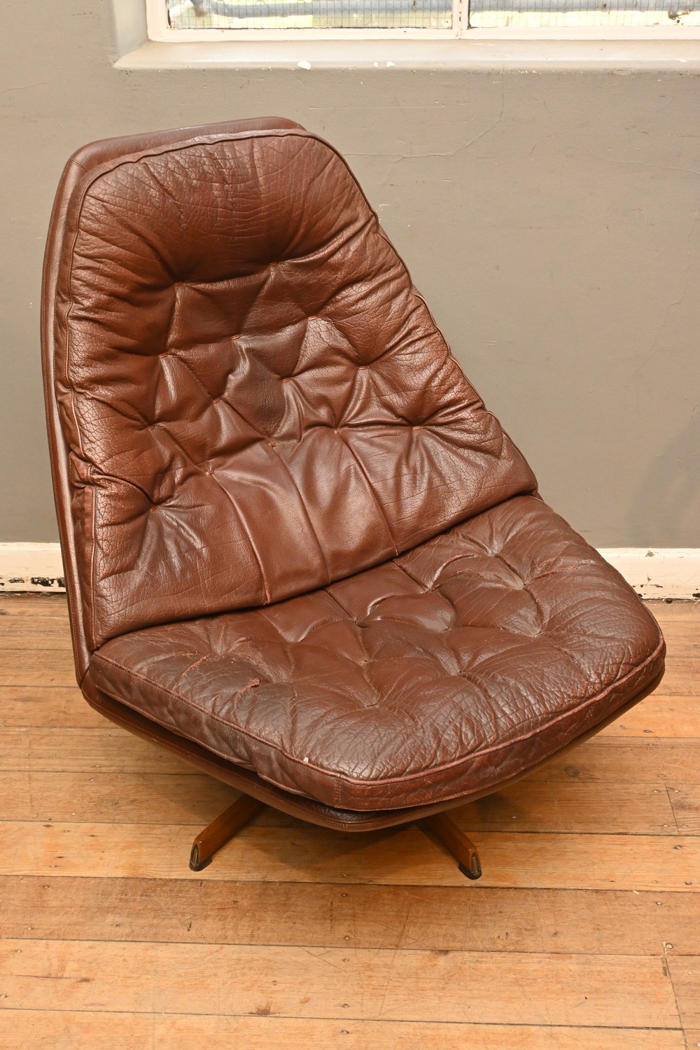 A DANISH MID-CENTURY SWIVEL CHAIR IN LEATHER MODEL MS 68 BY MADSEN SHUBEL (A/F) (92H X 81W X 91D CM) (THIS HEAVY ITEM MUST BE REMOVED BY CLIENTS OR CARRIERS AT THE CUSTOMERS EXPENSE. LEONARD JOEL STAFF CANNOT ASSIST CARRYING THIS ITEM)