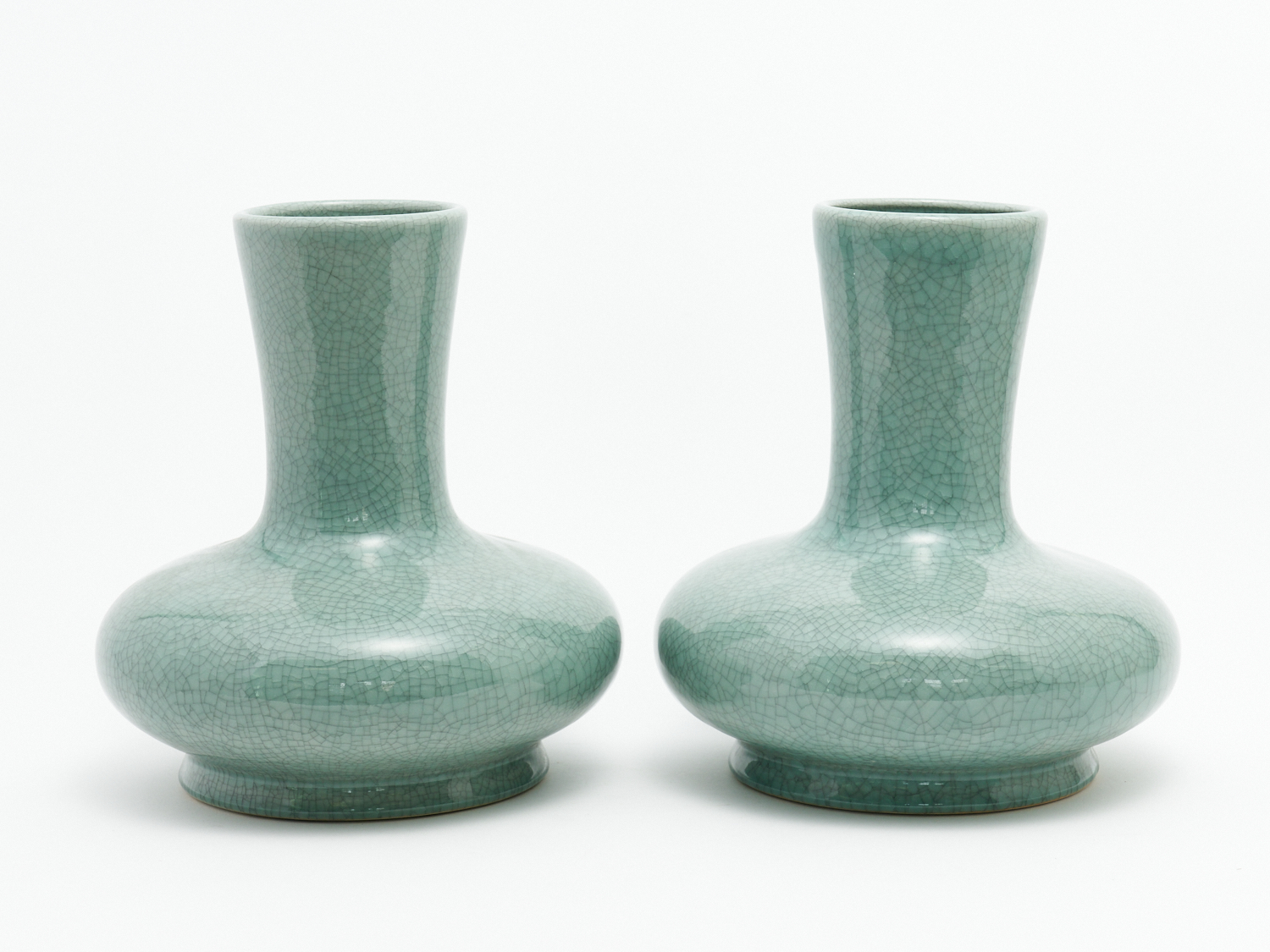 A PAIR OF CRACKLE GLAZE CELADON VASES H.33CM, LEONARD JOEL HOME DELIVERY SIZE: MEDIUM