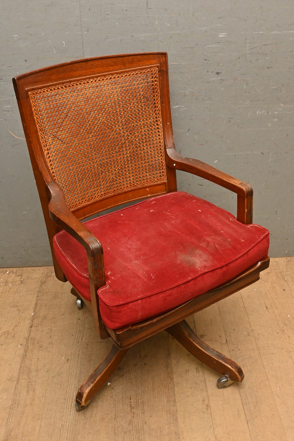 A HARDWOOD AND CANED SWIVELLING AND RECLINING DESK CHAIR (A/F) ( 97H X 57W X 63D CM) (LEONARD JOEL DELIVERY SIZE: X-LARGE)