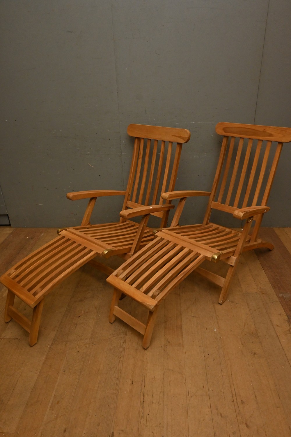 A PAIR OF TEAK STEAMER CHAIRS (100H X 60W X 156D CM) (LEONARD JOEL DELIVERY SIZE: X-LARGE)