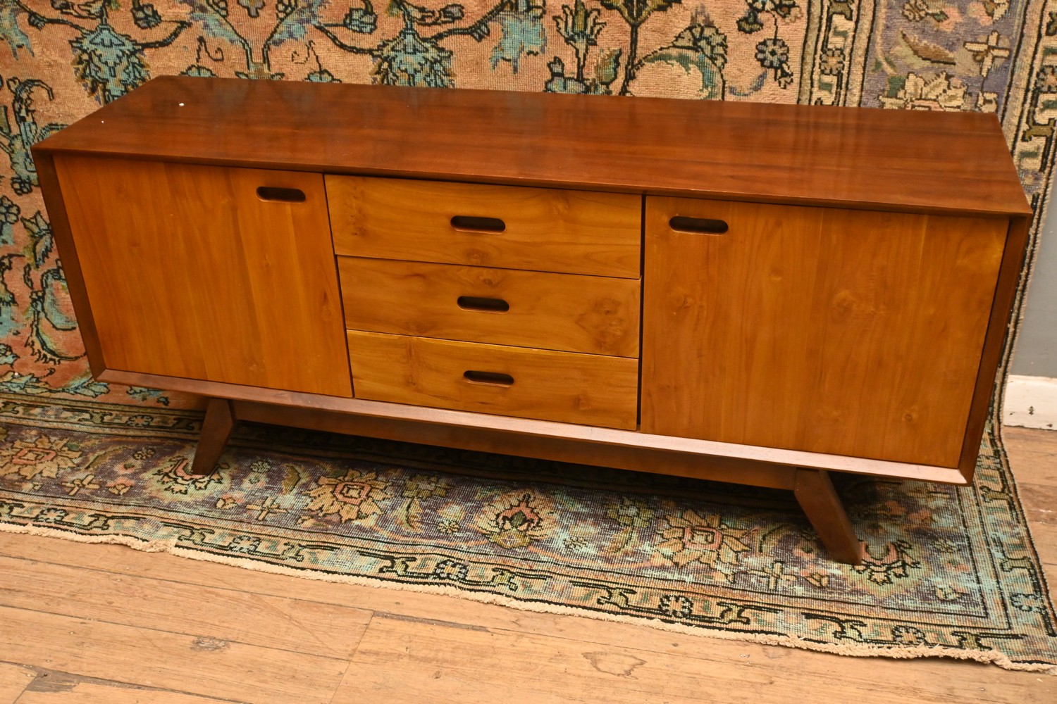 A MID-CENTURY STYLE TEAK SIDEBOARD (67H X 150W X 40D CM) (THIS HEAVY ITEM MUST BE REMOVED BY CLIENTS OR CARRIERS AT THE CUSTOMERS EXPENSE. LEONARD JOEL STAFF CANNOT ASSIST CARRYING THIS ITEM)