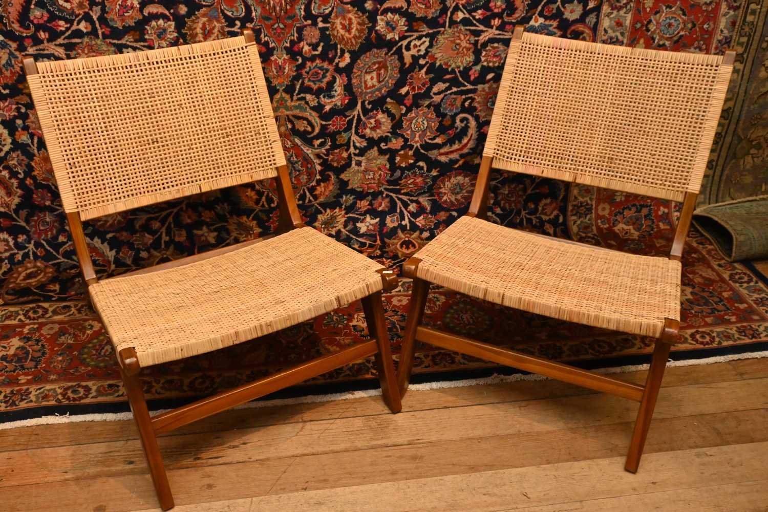 A PAIR OF TEAK AND RATTAN LOUNGE CHAIRS (76H X 60W X 87D CM) (LEONARD JOEL DELIVERY SIZE: X-LARGE)