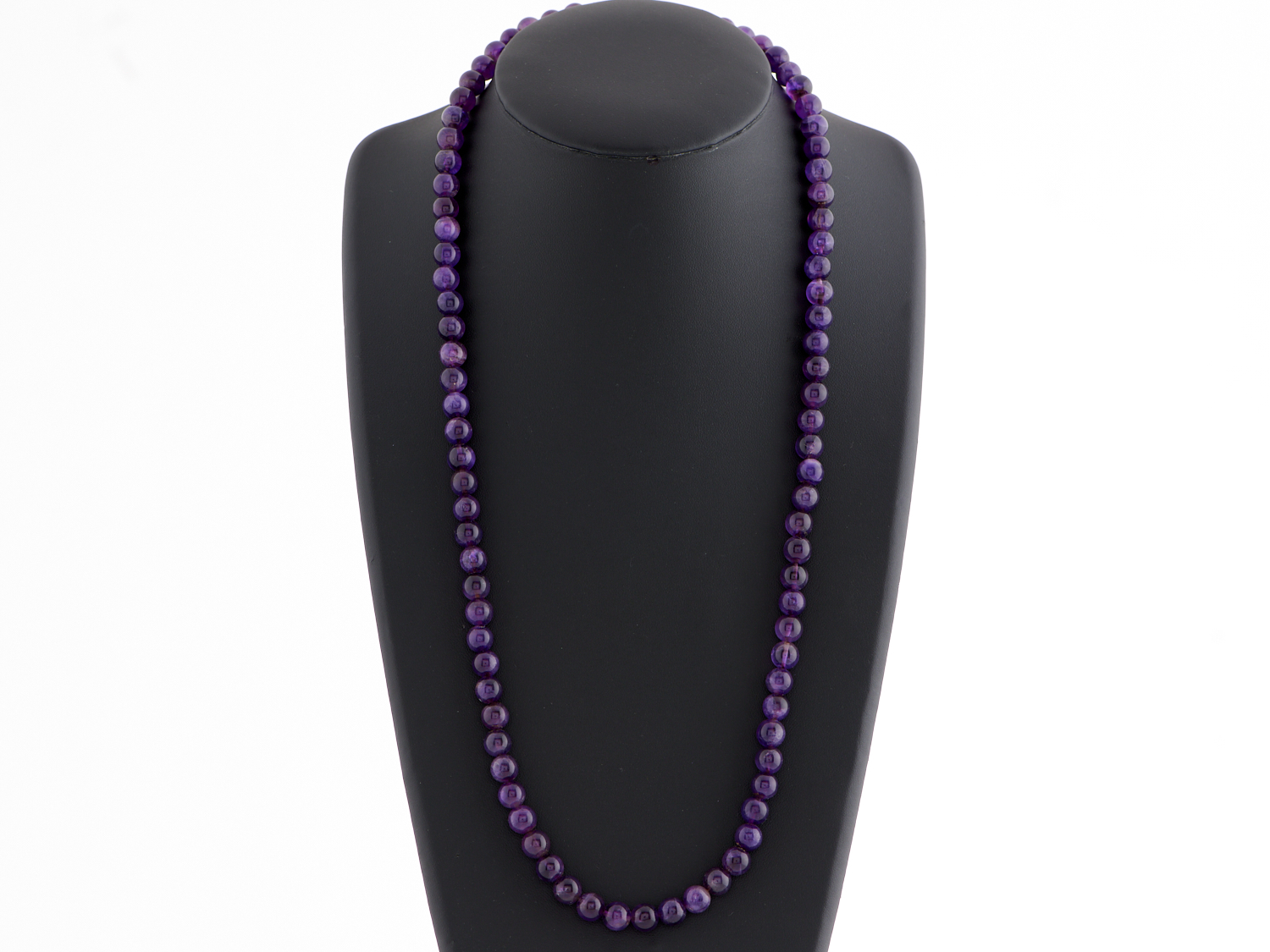 A STRAND OF AMETHYST BEADS TO A PEARL CLASP, BEAD DIAMETER 8MM, LENGTH 730MM