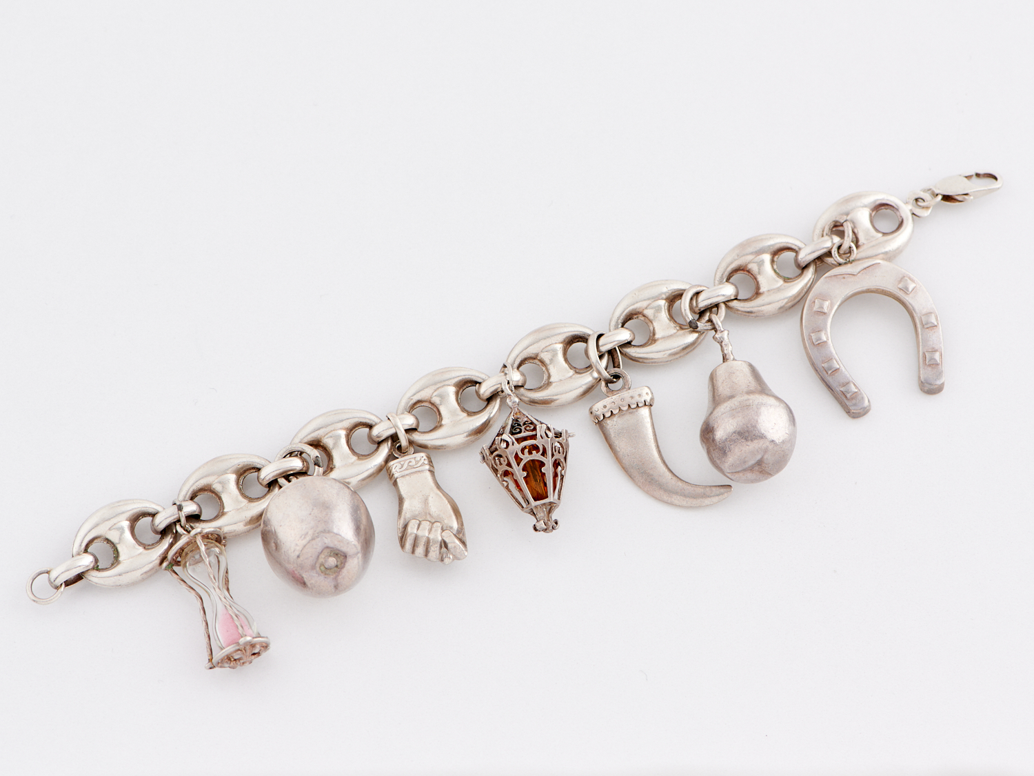 A CHARM BRACELET IN STERLING SILVER, LENGTH 200MM, WEIGHT 74.7GMS