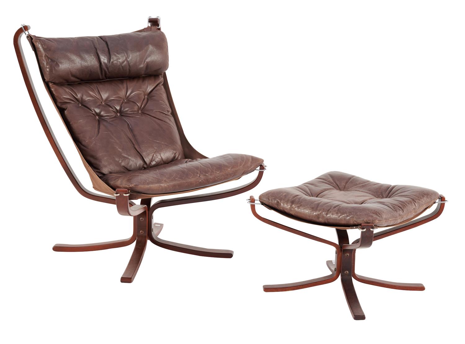 Wear to leather overall on both chair and ottoman, including one deep scratch to front left side of chair. Frame in good condition overall, with minor surface marks consistent with age and use. Comfortable and structurally sound.