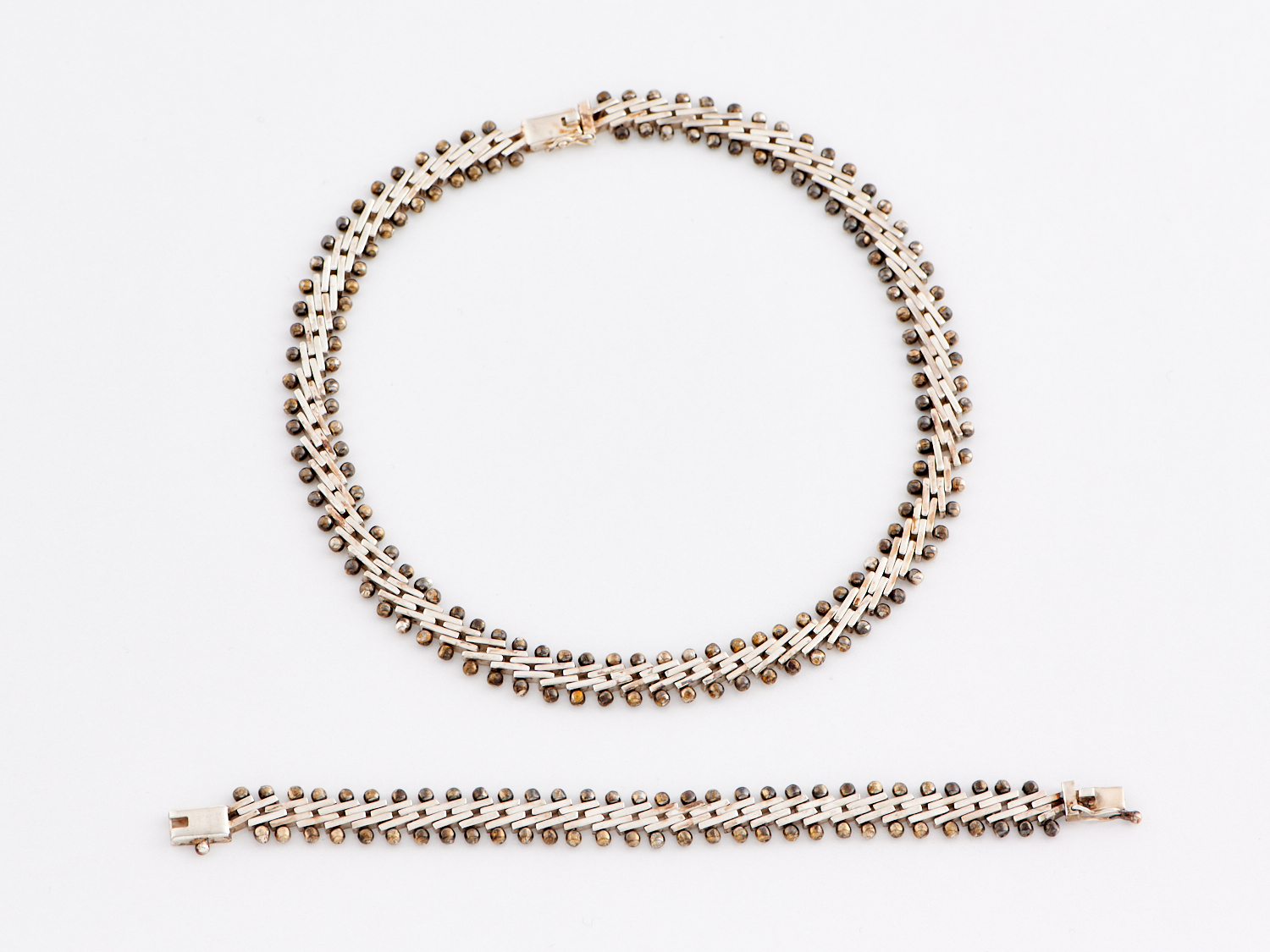 A MODERNIST NECKLACE AND BRACELET SUITE IN STERLING SILVER, NECKLACE LENGTH 425MM, BRACELET LENGTH 180MM, 100.2GMS