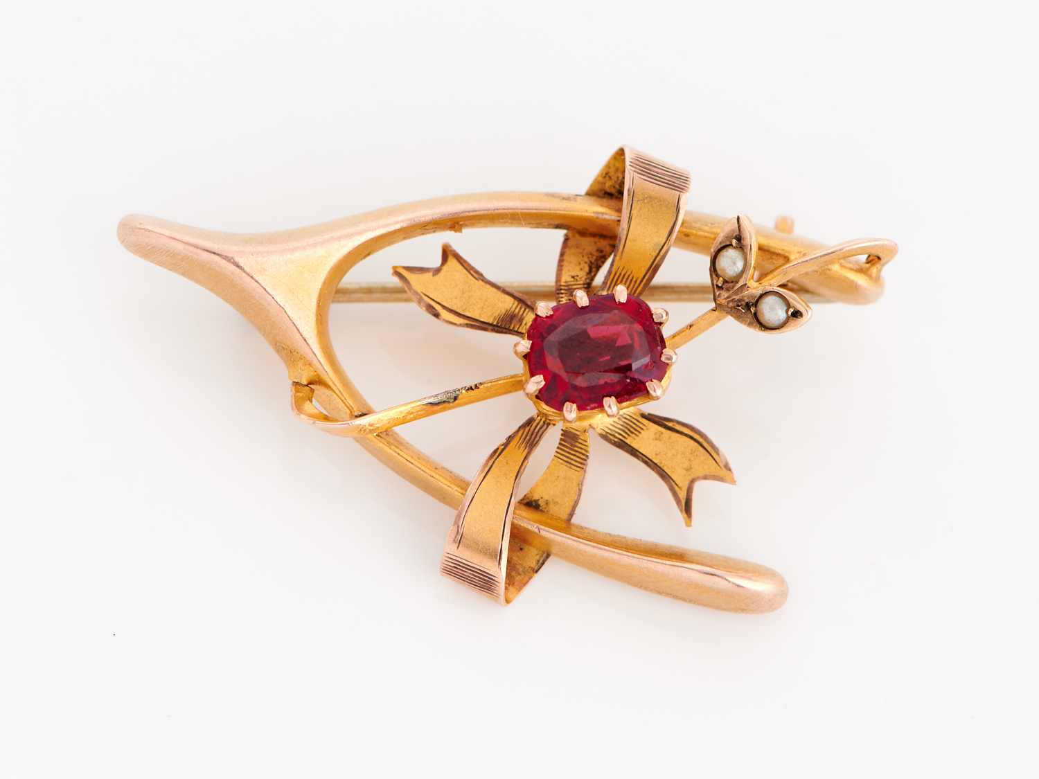 AN ANTIQUE PASTE AND SEED PEARL WISHBONE BROOCH IN 9CT GOLD, PIN IN BASE METAL, SIZE 22 X 36MM, WEIGHT 2.6GMS