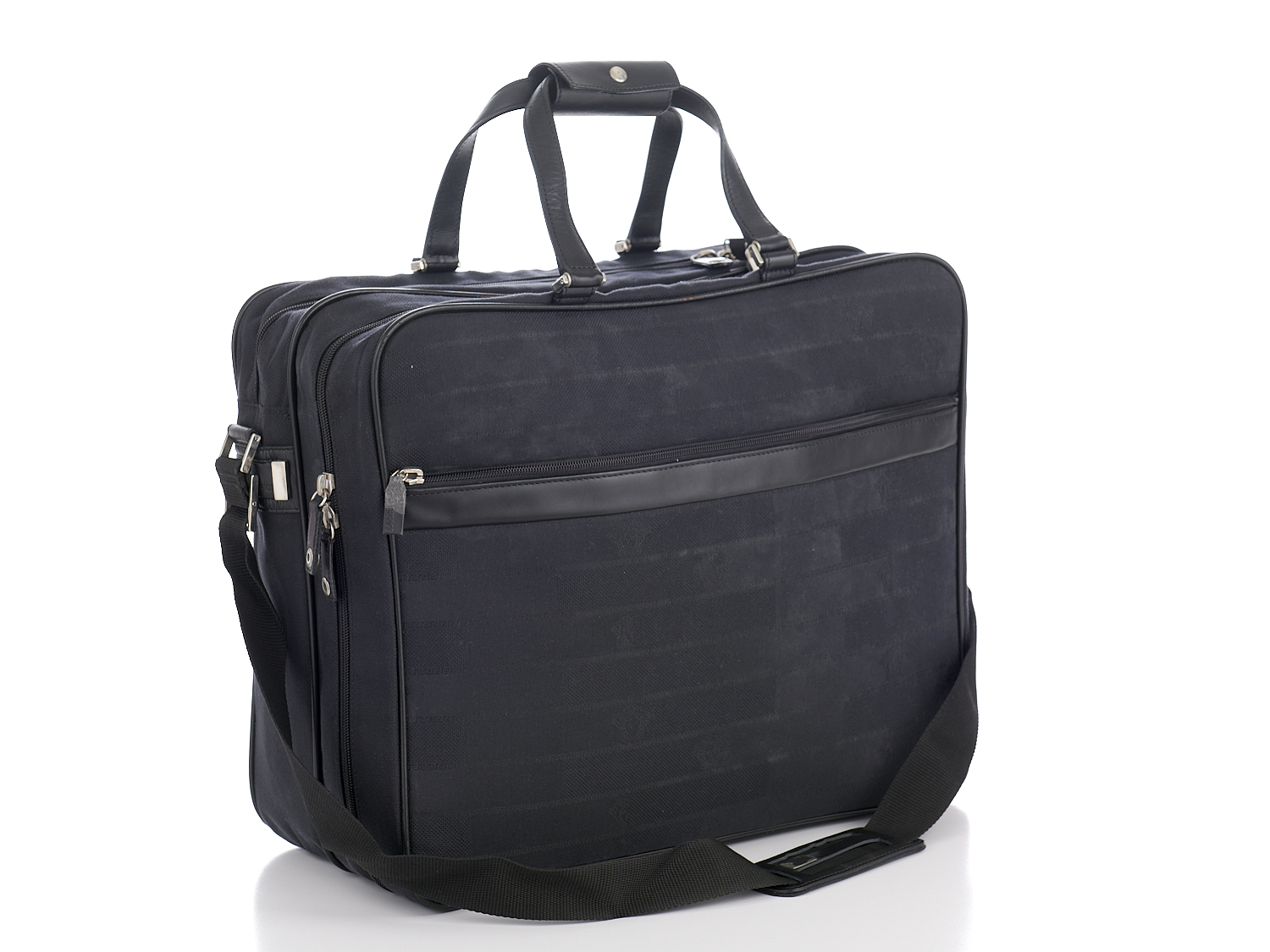 GIANNI VERSACE, DOUBLE COMPARTMENT OVERNIGHT BAG - Styled in black fabric with black leather trim.