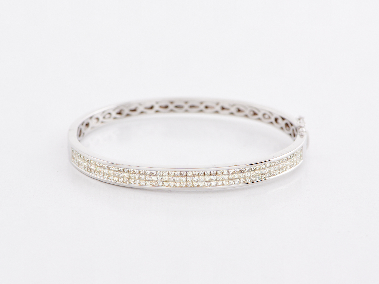 A HINGED DIAMOND BANGLE IN 18CT WHITE GOLD, THE DIAMONDS TOTALLING 2.95CTS, WIDTH 7MM, INNER DIAMETER 60MM, WEIGHT 21.8GMS