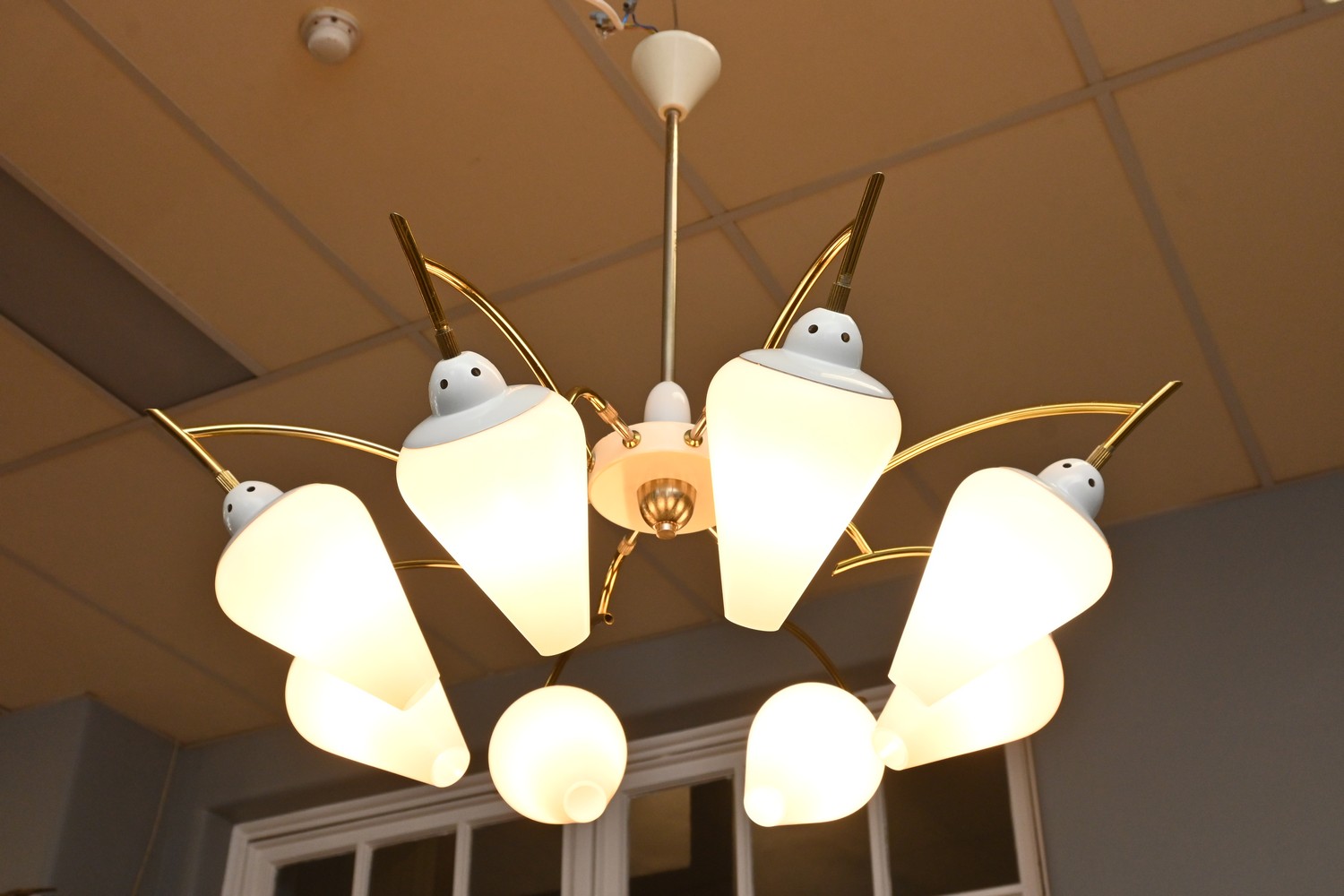 AN EIGHT BRANCH AUSTRALIAN MID-CENTURY CHANDELIER IN THE STYLE OF STILNOVO (74H X 63D CM) (LEONARD JOEL DELIVERY SIZE: X-LARGE)