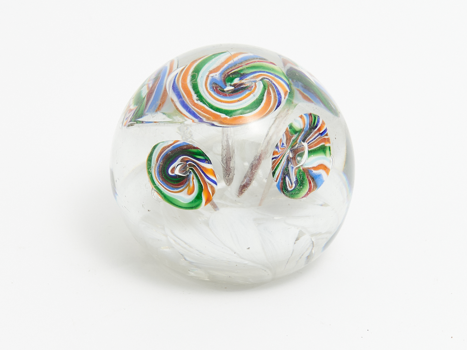 AN ANTIQUE BOHEMIAN GLASS PAPERWEIGHT WITH COLOURFUL TRUMPET FLOWERS IN A VASE, CIRCA 1900 (A/F) H.7.5CM, LEONARD JOEL LOCAL DELIVERY: SMALL