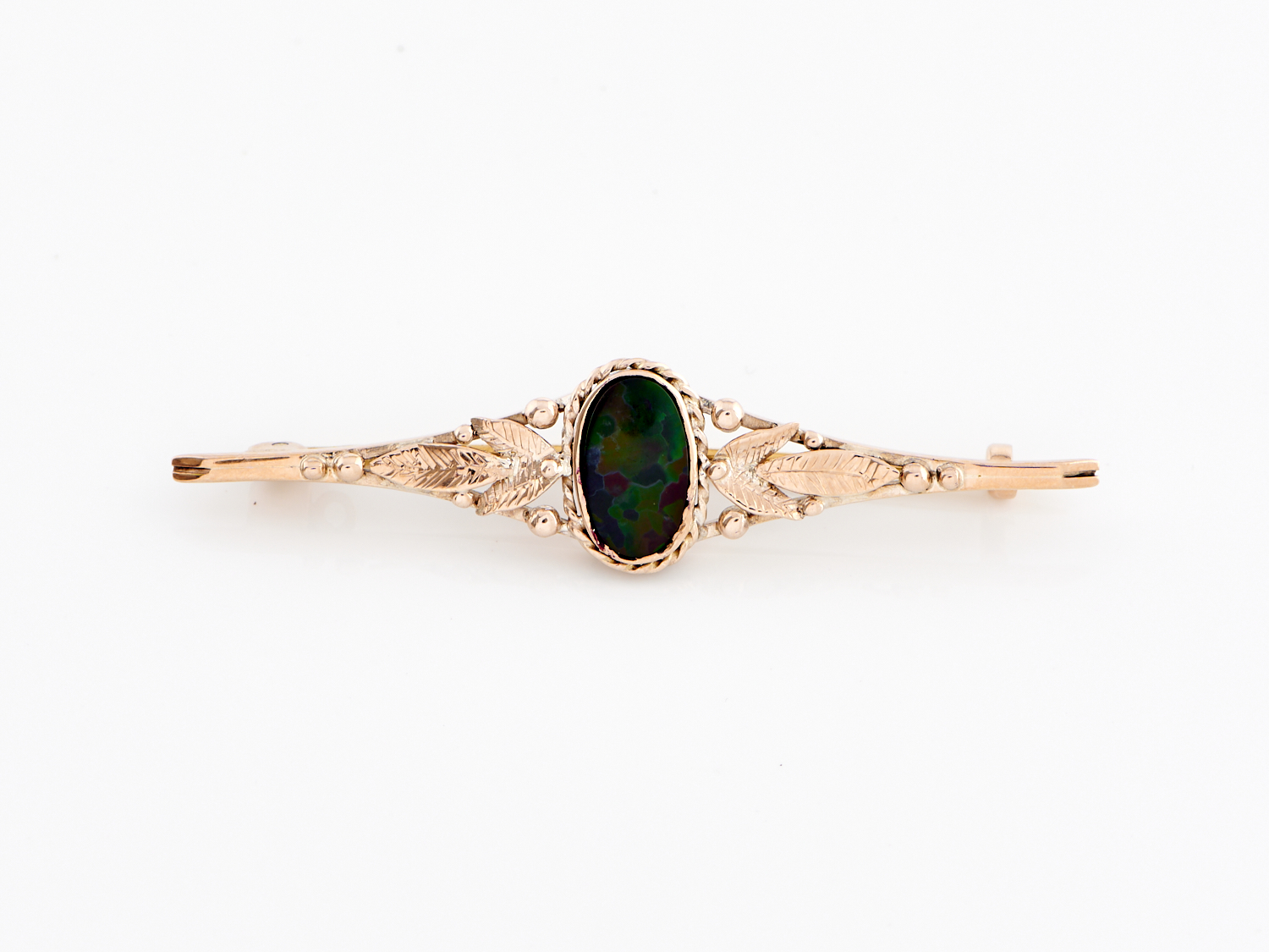 A BLACK OPAL BROOCH IN 9CT TWO TONE GOLD, LENGTH 63MM, 5.1GMS