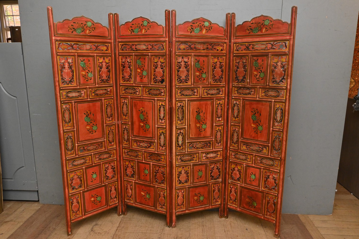 AN INDIAN CARVED AND HAND-PAINTED FOUR-LEAF SCREEN (A/F) (182H X 51W CM PER PANEL) (PLEASE NOTE THIS HEAVY ITEM MUST BE REMOVED BY CARRIERS AT THE CUSTOMER'S EXPENSE. LEONARD JOEL STAFF CANNOT ASSIST CARRYING THIS ITEM) (X-LARGE ITEM)