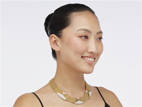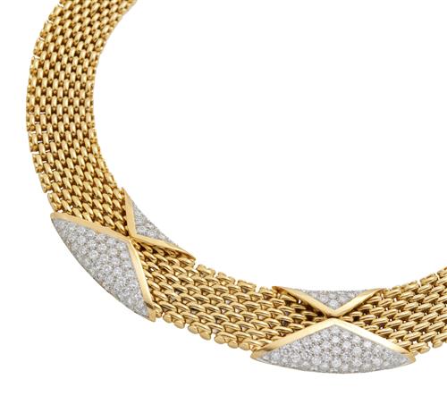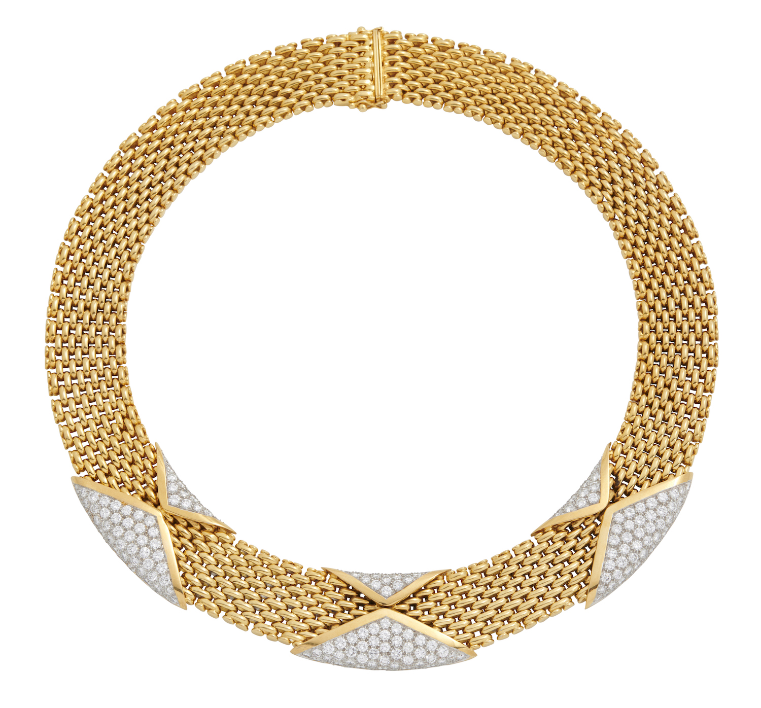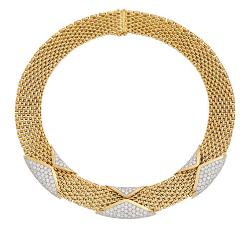 Modelled as a brick link collar decorated to the front at intervals with six geometric plaques pavé-set with brilliant-cut diamonds, the diamonds together weighing approximately 13.75 carats, inner circumference 400mm, gross weight approximately 243 grams.