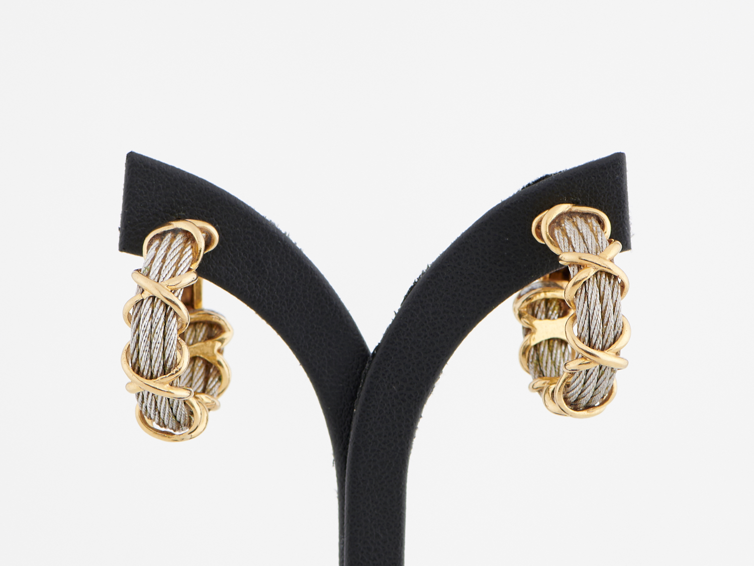 A PAIR OF 18CT GOLD AND STANLESS STEEL 'FORCE 10' EARRINGS BY FRED, PARIS, DIAMETER 25MM, WEIGHT 16GMS