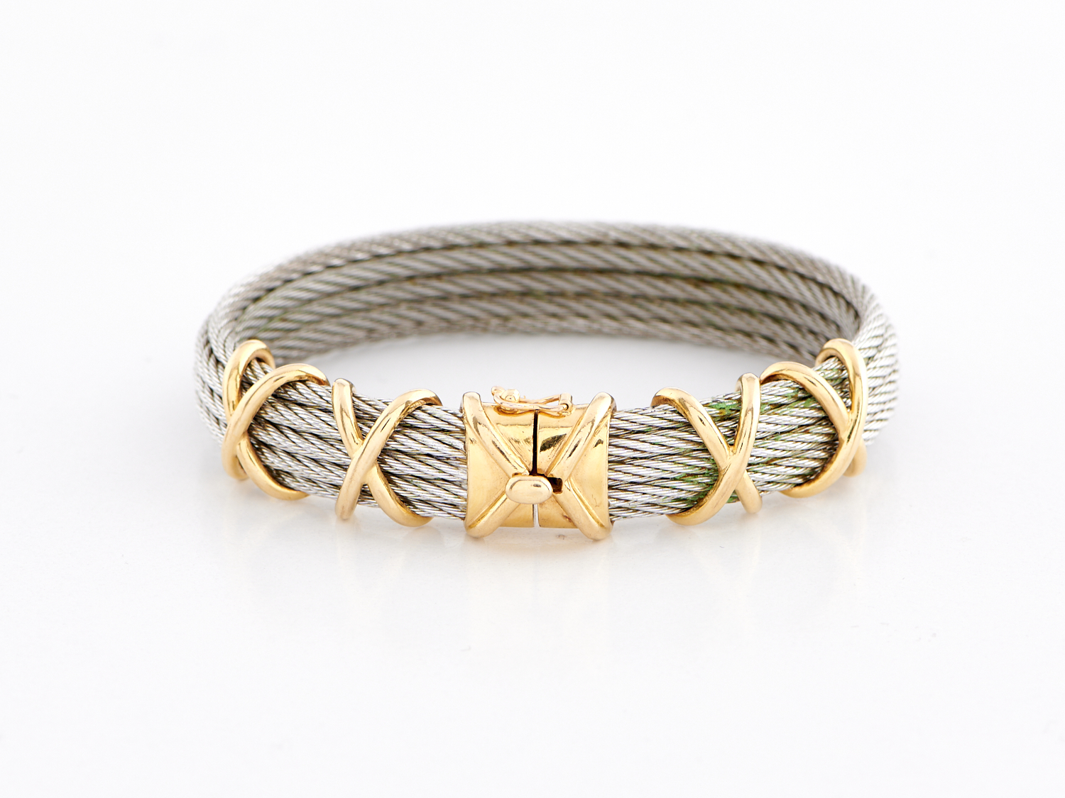 AN 18CT GOLD AND STAINLESS STEEL 'FORCE 10' BRACELET BY FRED, PARIS, INNER DIAMETER 57MM, WEIGHT 50.6GMS