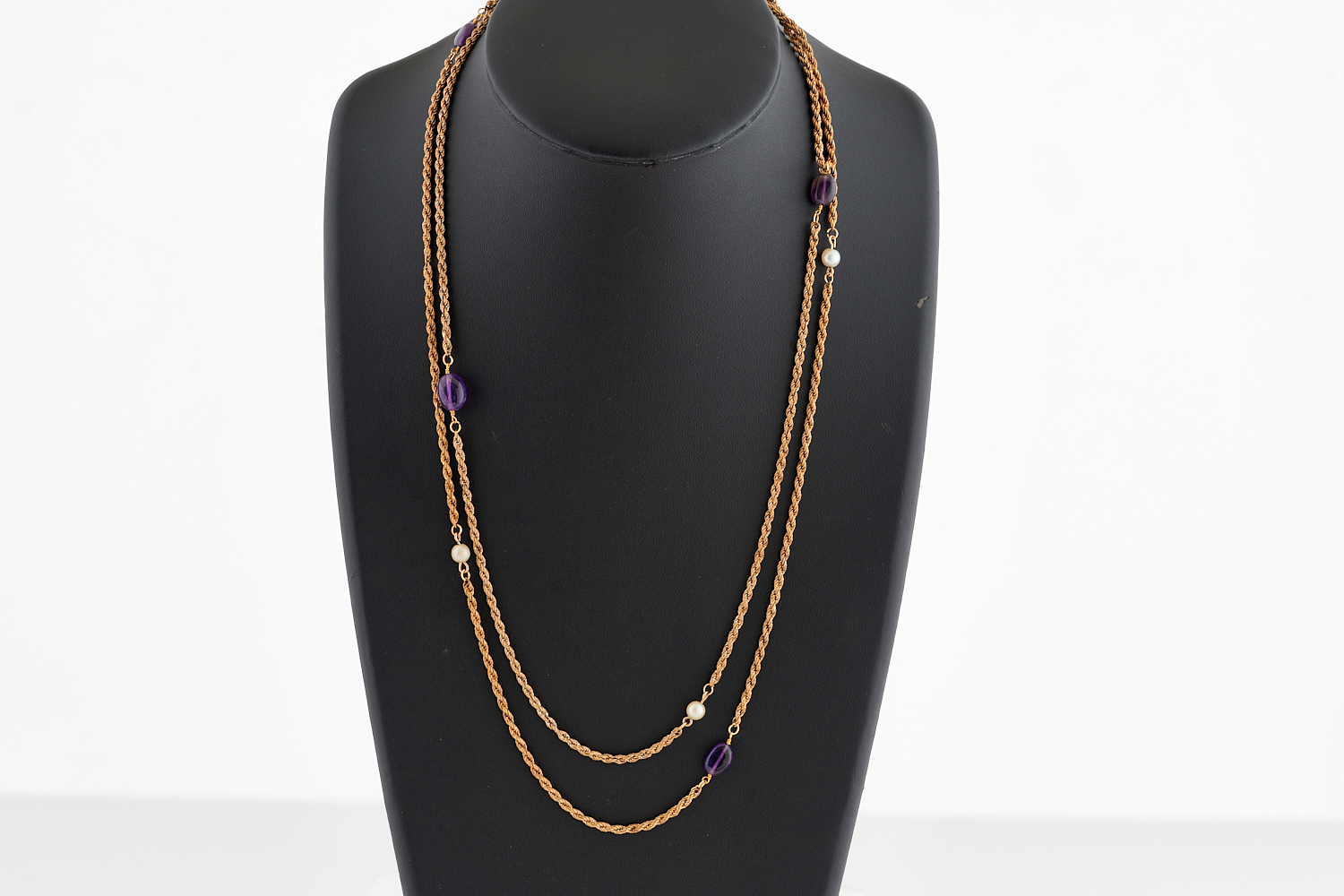A ROPE STYLED GUARD CHAIN IN GOLD PLATE, WITH AMETHYST BEADS AND CULTURED PEARL DETAIL, 1410MM