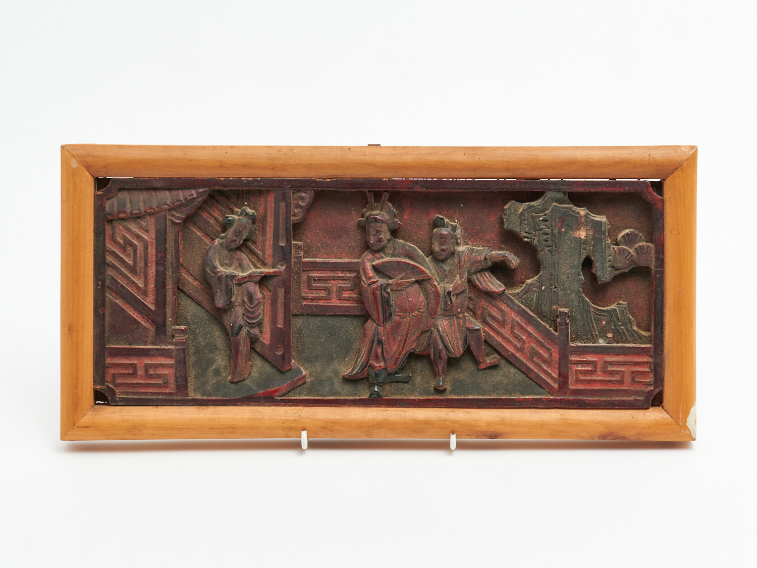 A CHINESE CARVED AND LACQUERED PANEL WITH COURT SCENE, QING DYNASTY H.18CM X W.38.5CM, LEONARD JOEL LOCAL DELIVERY: SMALL