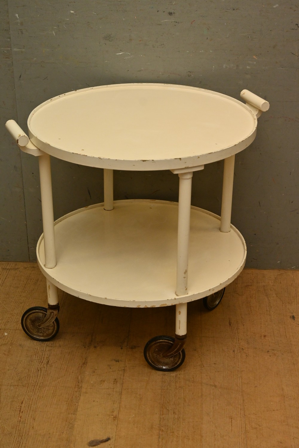 A 1930'S TWO TIER DRINKS TROLLEY ON CASTORS (A/F) (65H X 71D CM) (LEONARD JOEL DELIVERY SIZE: LARGE)