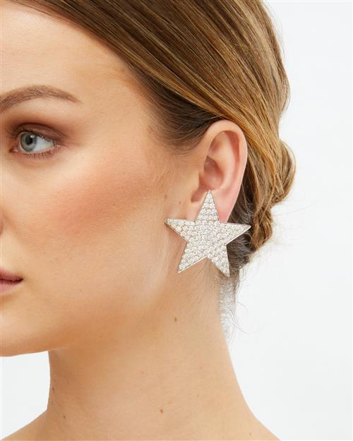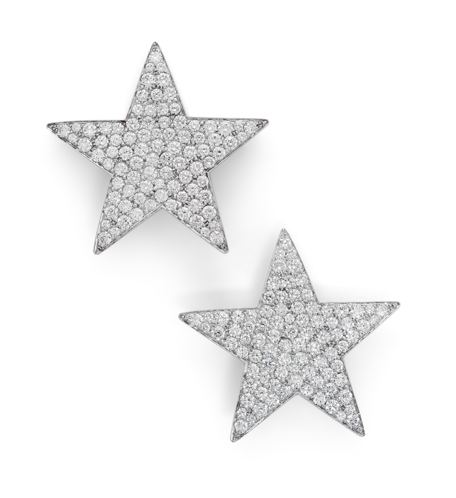 Each modelled as a five-point star, pavé-set to the front with brilliant-cut diamonds, the diamonds estimated to weigh approximately 5.50 - 6.00 carats, mounted in 18ct white gold, length 46mm, 14ct white gold post and clip fittings.