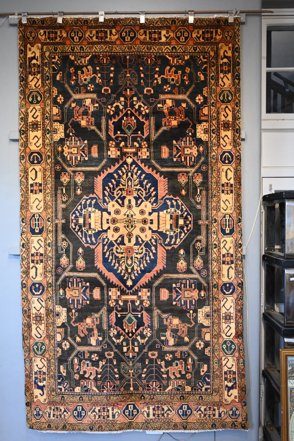 A PERSIAN NAHAVAND RUG. 100% THICK WOOL PILE, NATURAL DYES. FINELY HAND-KNOTTED VILLAGE WEAVE WITH DESIGN OF CENTRAL ELONGATED MEDALLION, VARYING FLORAL & "TREE OF LIFE" PATTERNS, TRIBAL & ANIMAL MOTIFS ON A CHARCOAL FIELD. BORDER OF CARTOUCHES FILLED WITH TRIBAL MOTIFS & FLORAL MINIATURE ROSETTES. SIZE: 285 X 155 CM ORIGIN: PERSIA - RRP: $3,400 DOCUMENTATION OF AUTHENTICITY INCLUDED.