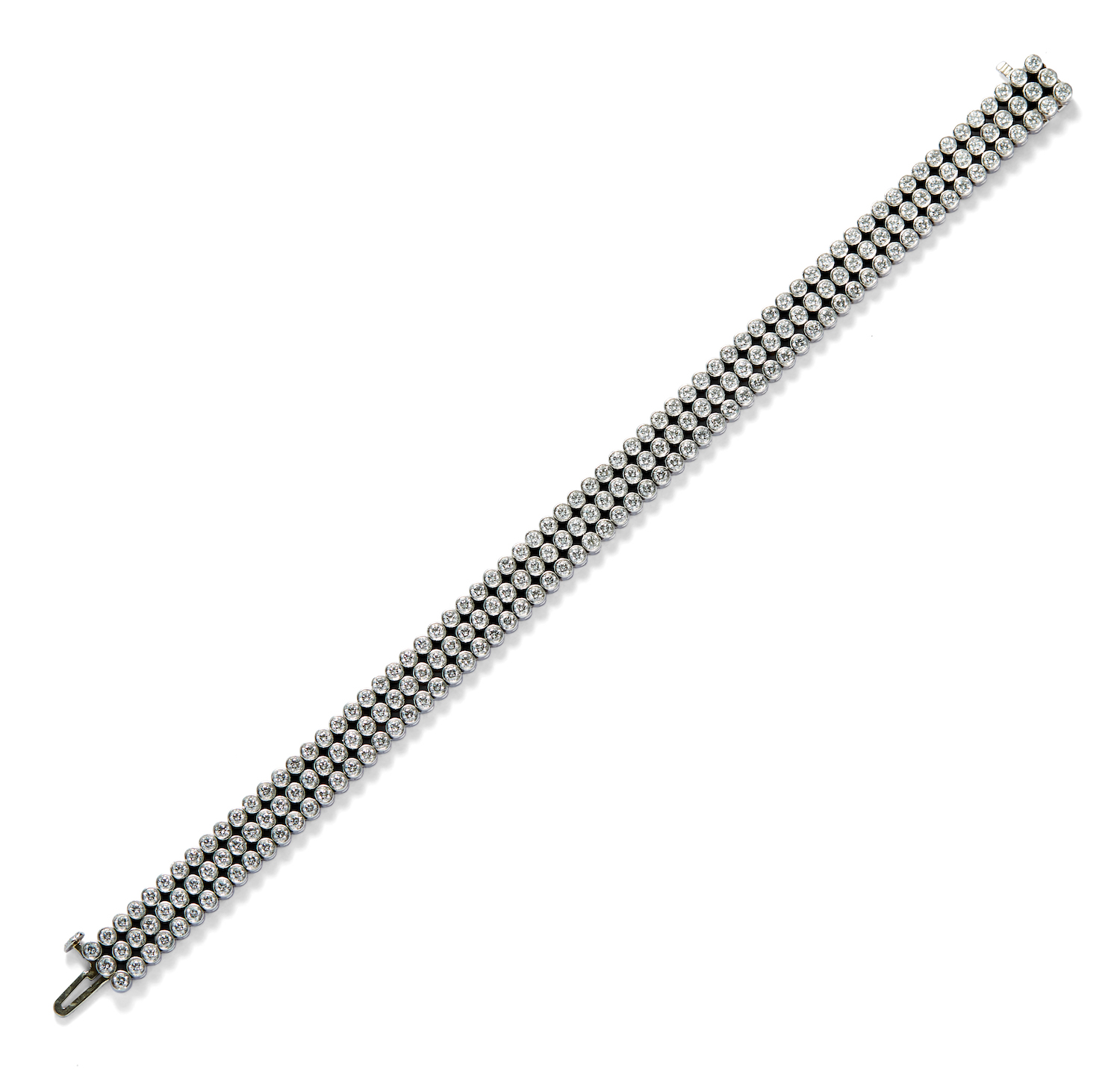 Modelled as a triple line of collet-set brilliant-cut diamonds, completed by a concealed box clasp, the diamonds together weighing approximately 3.00 carats, mounted in platinum, length 155mm, signed Tiffany & Co.