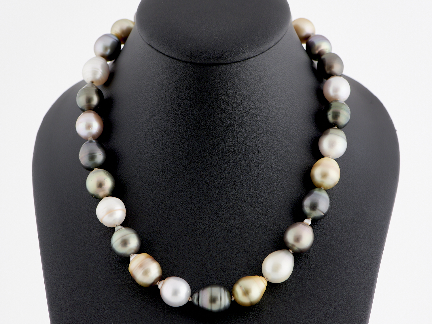 A SOUTH SEA AND TAHITIAN PEARL NECKLACE, THE PEARLS MEASURING APPROXIMATELY 11.2 - 13.4MM, COMPLETED BY A PARROT CLASP IN 18CT GOLD, LENGTH 440MM