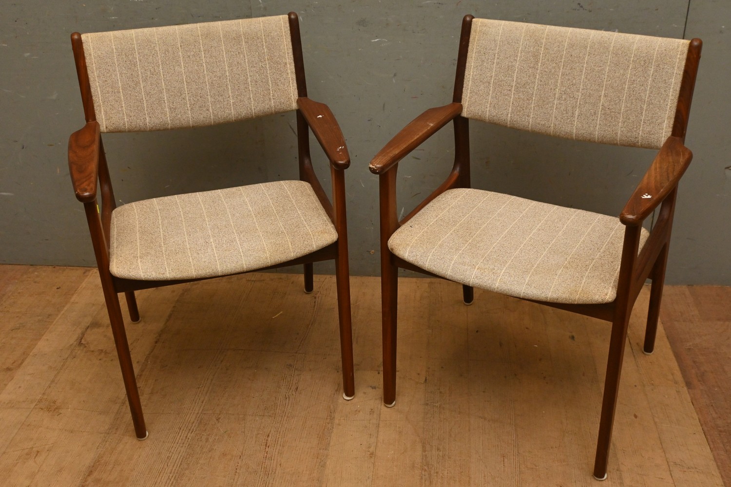 A PAIR OF DANISH TEAK MID CENTURY ARMCHAIRS (A/F) ( 85H X 60W X 54D CM) (LEONARD JOEL DELIVERY SIZE: LARGE)