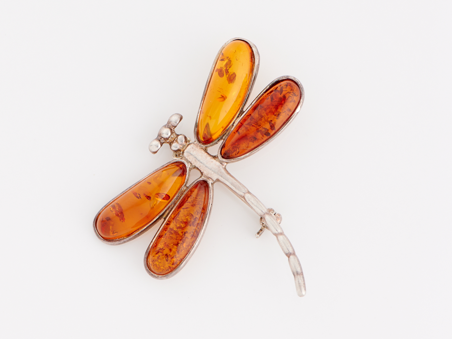 AN AMBER SET DRAGON FLY BROOCH IN STERLING SILVER, 40 X 45MM