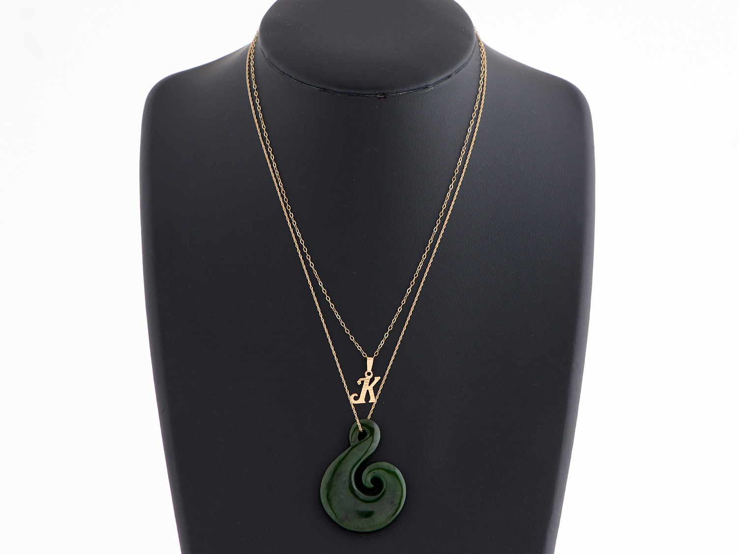 A JADEITE PENDANT TO A FINE CHAIN IN 9CT GOLD TOGETHER WITH A 'K' INITIAL PENDANT TO A FINE CHAIN IN 9CT GOLD, WEIGHT .95GMS