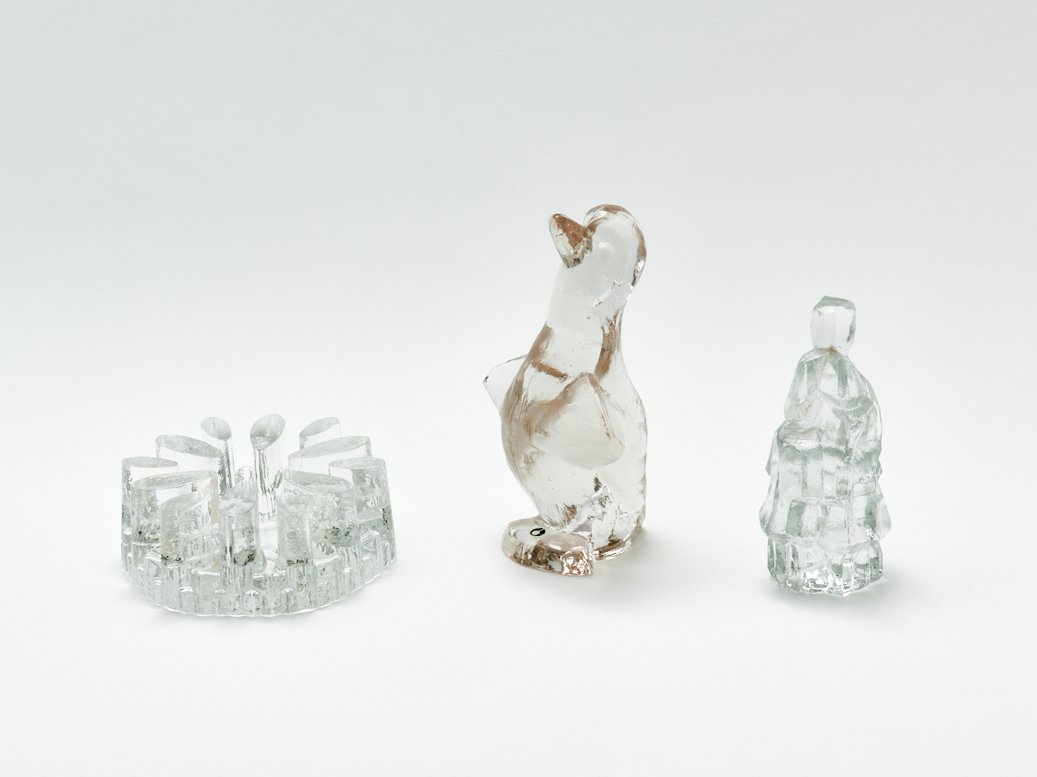A GROUP OF THREE PUKEBERG ICE GLASS ITEMS INCLUDING LARGE PENGUIN, EMBRACING COUPLE AND CANDLEHOLDER, H.20.5CM (TALLEST), LEONARD JOEL LOCAL DELIVERY: SMALL
