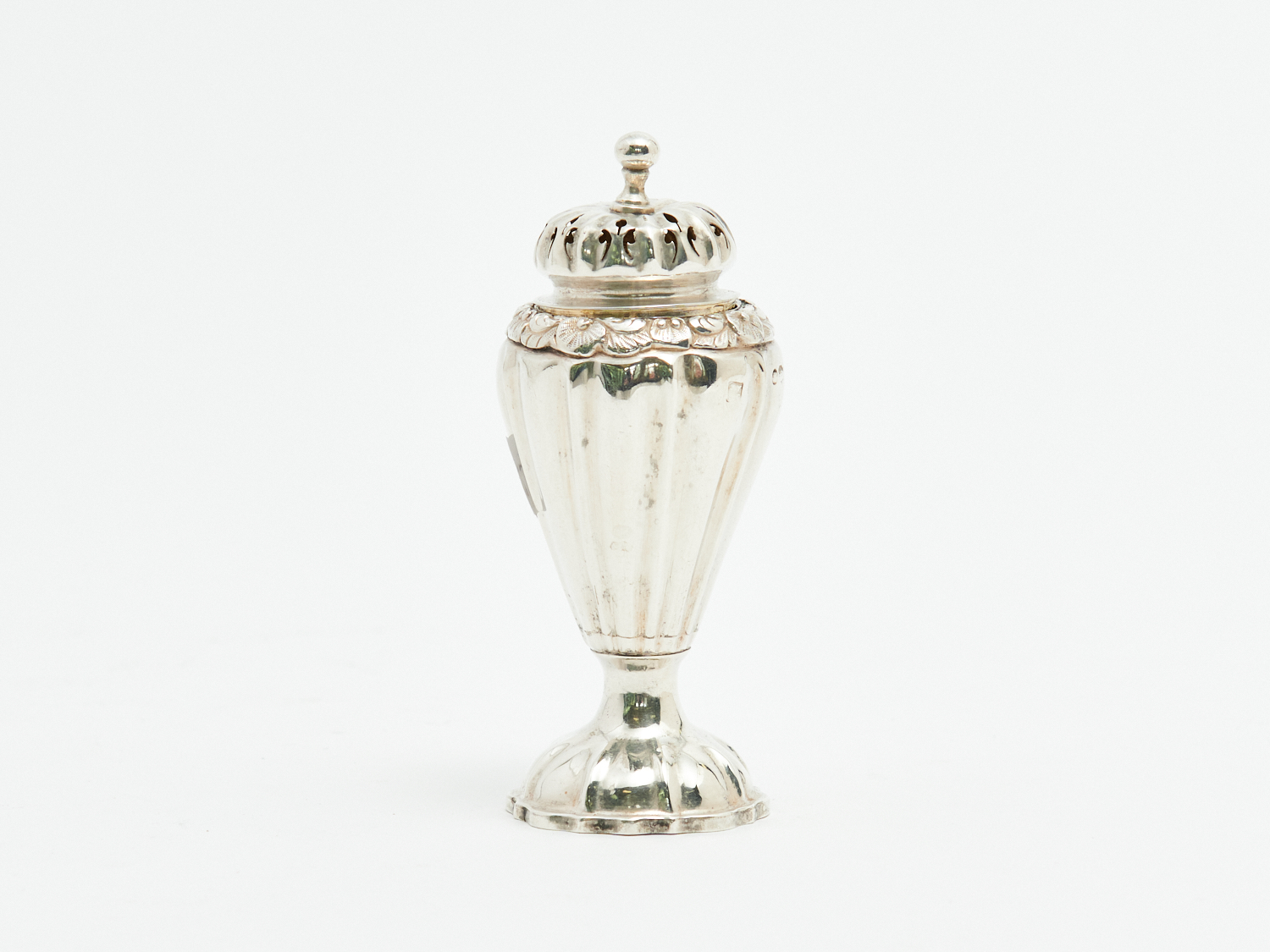 A GEORGIAN STERLING SILVER FLORAL EMBOSSED POUNCE POT H.9.5CM, LEONARD JOEL LOCAL DELIVERY: SMALL