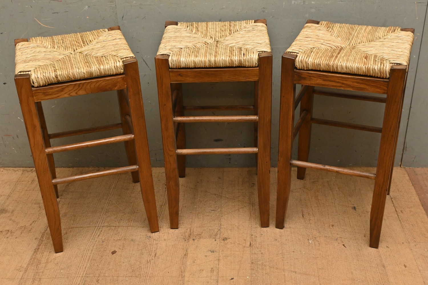 A SET OF THREE RUSH SEATED OAK BARSTOOLS (66H X 35W X 35D CM) (LEONARD JOEL DELIVERY SIZE: LARGE)